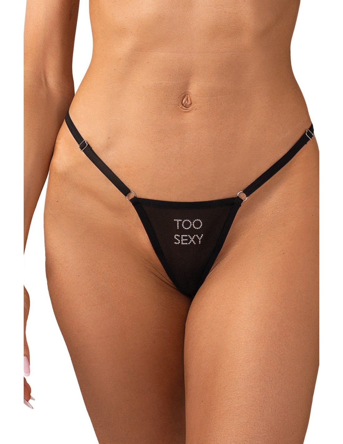 Stringi "Too Sexy" to perfekcyjna propozycja dla kobiet, które lubią bawić się stylem, prowokować i podkreślać swoją pewność siebie. Transparentna siateczka subtelnie odsłania ciało, nadając całości drapieżnego, cudownie zmysłowego charakteru. Błyszczący napis "Too Sexy", wykonany jest z połyskujących cyrkonii, przyciąga spojrzenia i stanowi wyrazisty akcent, który mówi więcej niż słowa. Dzięki regulowanym paskom stringi wyśmienicie dopasowują się do sylwetki, podkreślając biodra i zapewniając pełen komfort użytkowania. To model, który sprawdzi się wszędzie tam, gdzie liczy się efekt "wow" - na randce, w łóżku lub jako pikantny prezent.