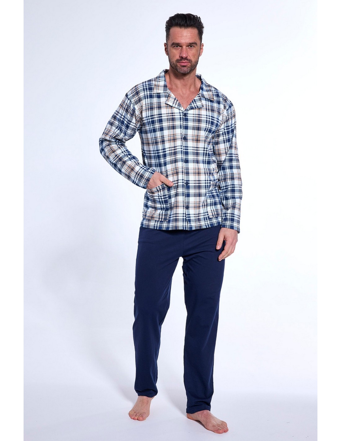 Klasyczna piżama męska z długim rękawem i kołnierzykiem, rozpinana. Na wysokości bioder kieszenie.