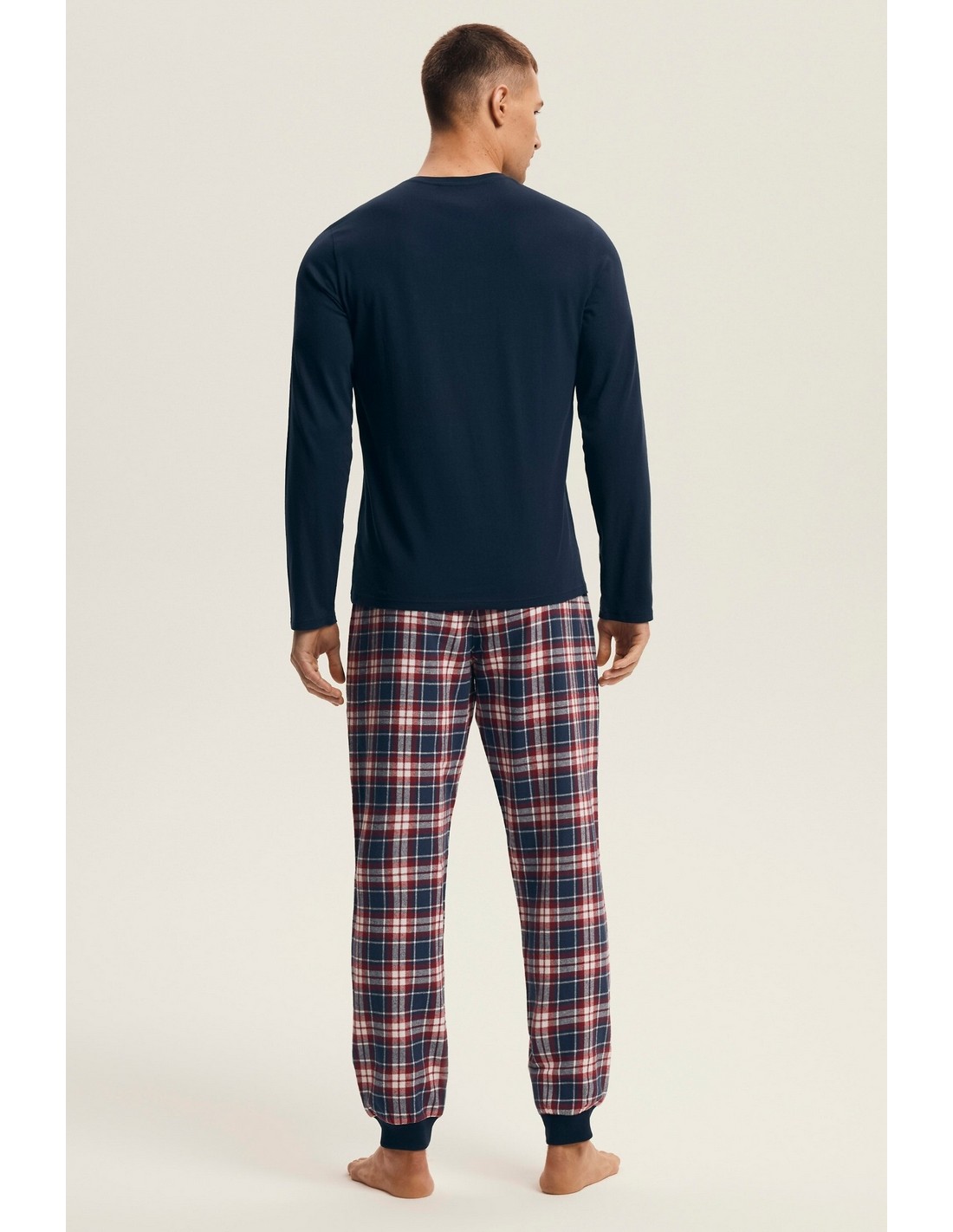 Piżama męska NOIR 43457 to ponadczasowa propozycja na chłodniejsze wieczory. Góra z długim rękawem i zapięciem na guziki typu henley w granatowym kolorze świetnie współgra z klasycznymi spodniami w czerwono-granatową kratę.