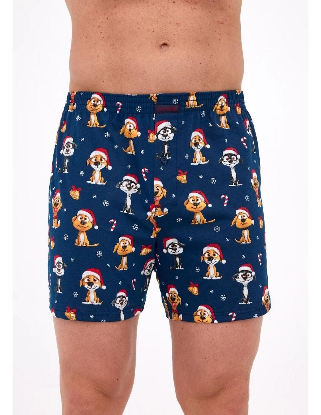 - luźne bokserki męskie w głębokim granatowym kolorze zostały ozdobione zabawnym nadrukiem w świąteczne pieski w czapkach Mikołaja i z laskami cukrowymi