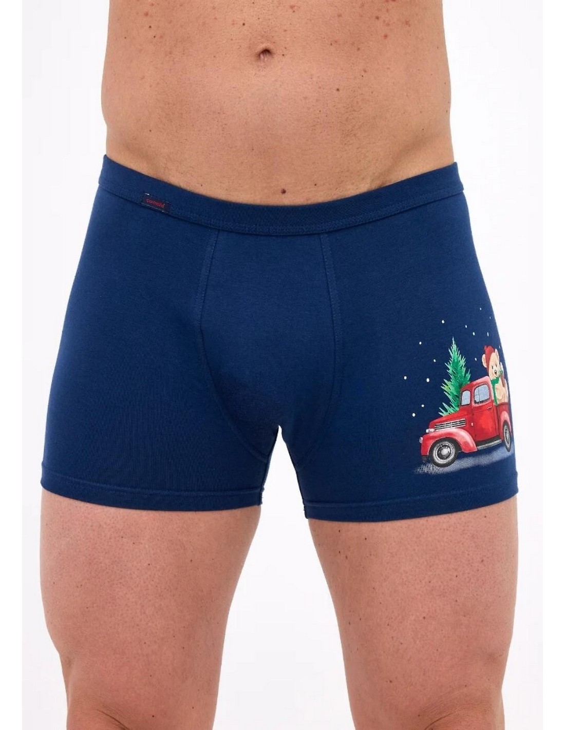 - obcisłe bokserki męskie w głębokim granatowym kolorze zostały ozdobione zabawnym nadrukiem misia jadącego czerwonym samochodem z choinką na dachu