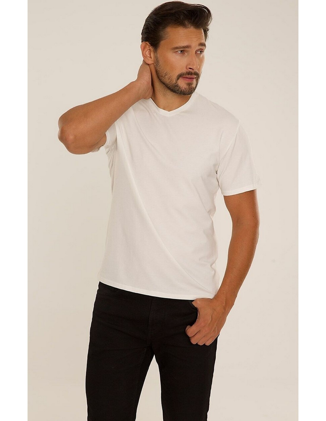 Koszulka posiada klasyczny krótki rękaw oraz dekolt w szpic, który podkreśla męski charakter stylizacji. Świetnie sprawdzi się zarówno jako samodzielny element garderoby, jak i pod bluzę czy marynarkę.