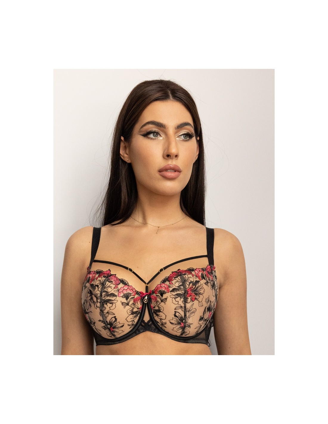 Ozdobne ramiączka dodają mu wyjątkowego charakteru. Miękki stanik half cup Krisline Flamenco posiada miski typu half-cup, oparte na fiszbinie, posiadają dwa cięcia pionowe oraz kieszonkę wewnętrzną, co zapewnia lepsze zebranie piersi spod pachy. Wykonany z delikatnego tiulu z pięknym haftem, biustonosz gwarantuje stabilność i wygodę noszenia. Regulowane, nieodpinane ramiączka oraz elastyczny pas obwodu z plastikowym fiszbinem bocznym zapobiegają rolowaniu. Mostek średniej wysokości z ozdobnymi paskami podkreśla dekolt.