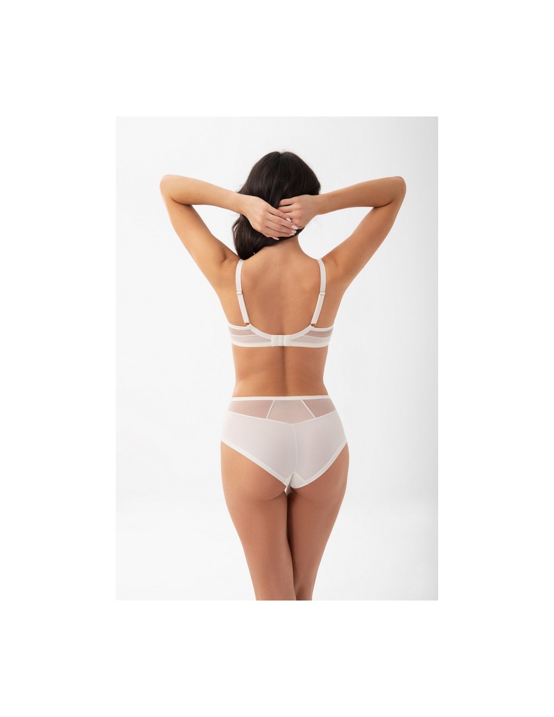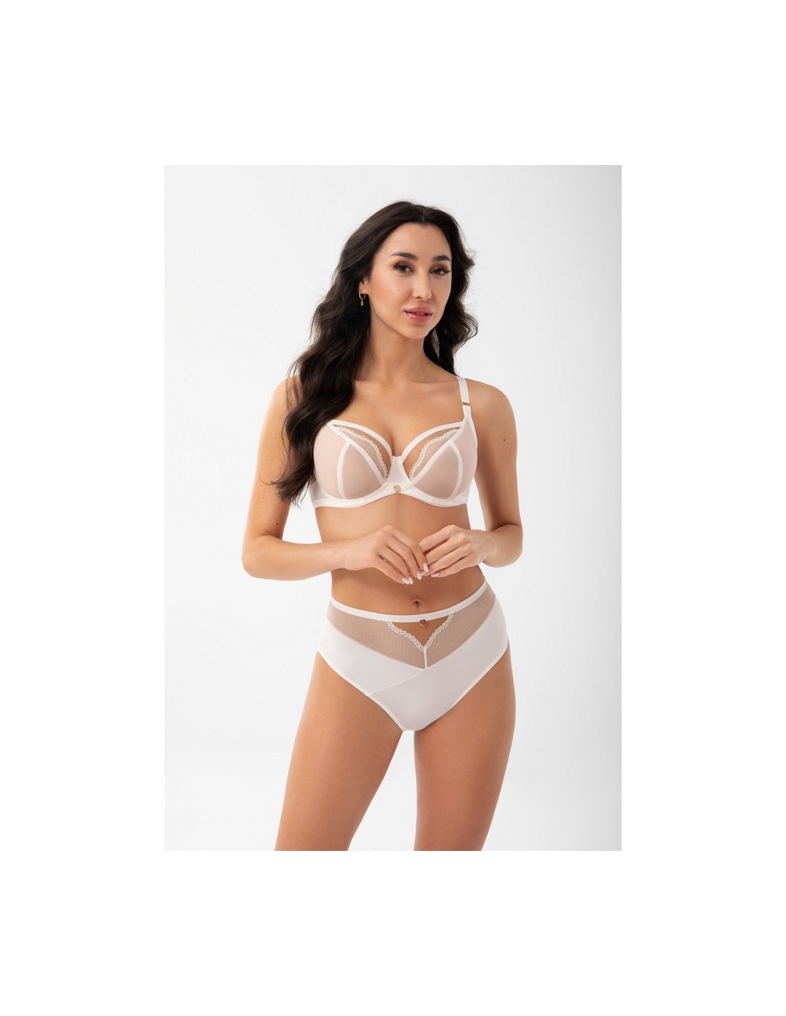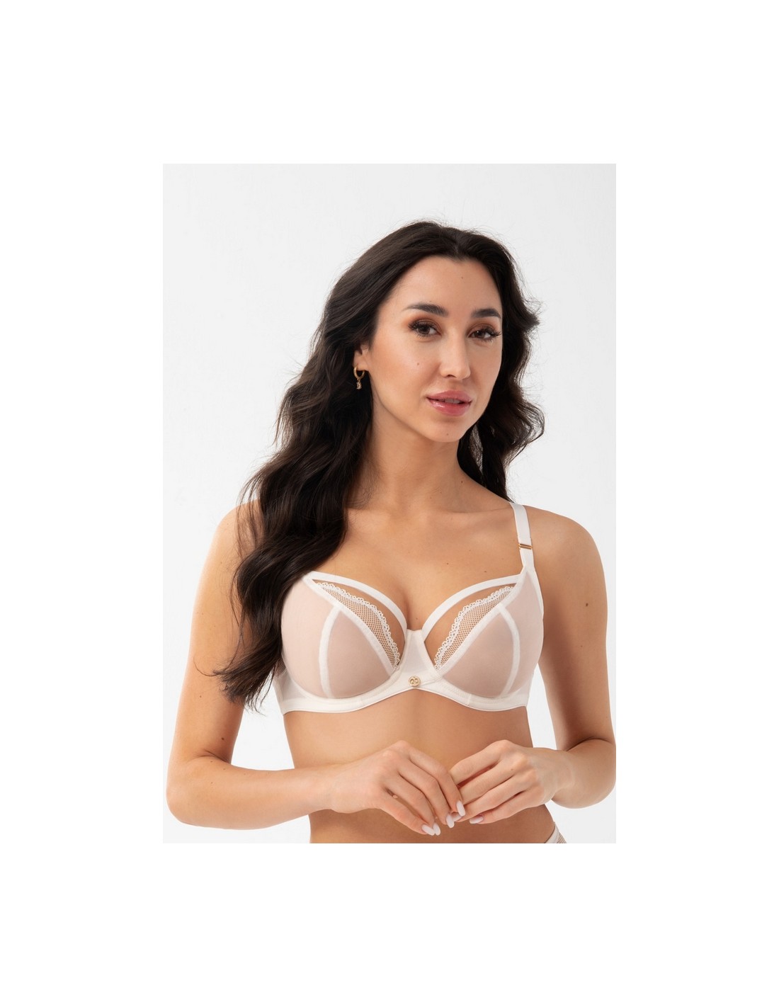 Biustonosz miękki przeznaczony dla pań ze średnim dużym i bardzo dużym biustem. Gwarantuje efekt mocnego uniesienia i zebrania biustu do środka, 3-częściowe miski wykonane z tiulu stabilnego oraz koronki elastycznej o wyglądzie kabaretki. Górna krawędź miski wykończona szeroką taśmą. Dla zwiększenia komfortu użytkowania górna krawędź pasa obwodu wykończona miękkimi lamówkami. Tył z kryjącej lycry połączonej z koronką elastyczną i tiulem. Tył z kryjącej lycry połączonej z koronką elastyczną i tiulem. Krzyżujący się mostek, wyprofilowany tak, aby nie powodować ucisków. Fiszbiny boczne zapobiegające zwijaniu się materiału. W zależności od rozmiaru dwu lub trzyrzędowa haftka z trójstopniową regulacją obwodu. Nieodpinane, regulowane ramiączka w trzech szerokościach. Metalowe elementy w kolorze jasnego złota (nie zawierają niklu)