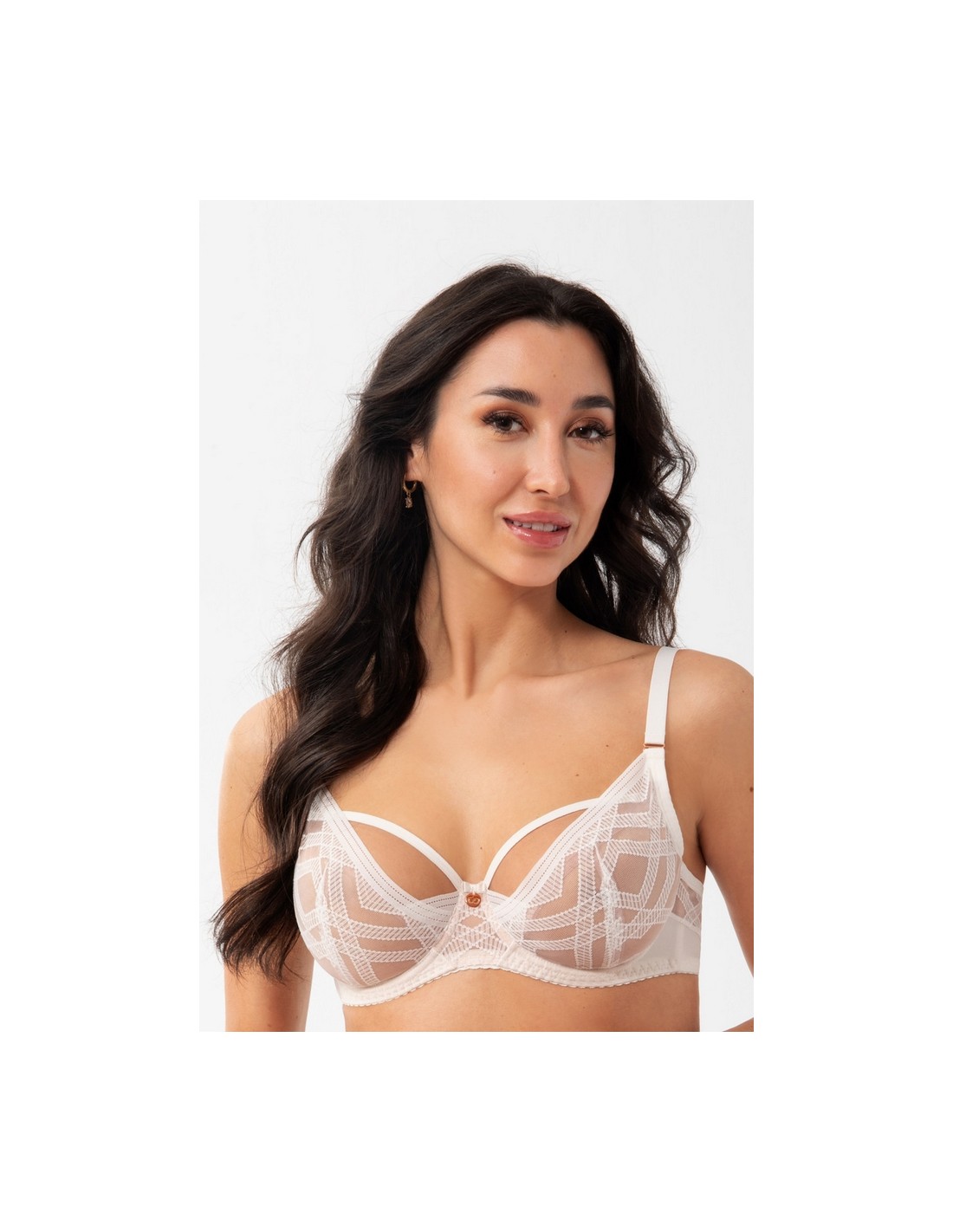 Biustonosz miękki przeznaczony dla kobiet ze średnim i dużym. Zapewnia efekt uniesienia i zebrania biustu do środka, 3-częściowe miski z tiulu stabilnego, pokryte dodatkową warstwą koronki elastycznej. Górna krawędź wykończona gładką taśmą. Dla zwiększenia komfortu użytkowania górna krawędź pasa obwodu wykończona miękkimi lamówkami. Ukryte fiszbiny boczne zapobiegające zwijaniu się materiału. Tył z kryjącej lycry połączonej z koronką elastyczną i tiulem. W zależności od rozmiaru dwu lub trzyrzędowa haftka z trójstopniową regulacją obwodu. Nieodpinane, ramiączka regulowane w trzech szerokościach. Nieodpinane, regulowane ramiączka w trzech szerokościach. Metalowe elementy w kolorze różowego złota (nie zawierają niklu)