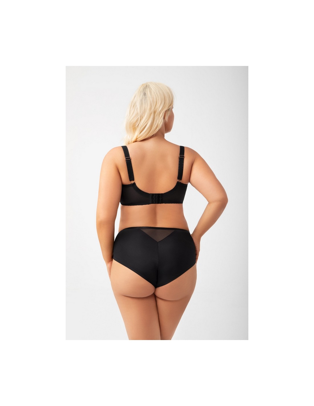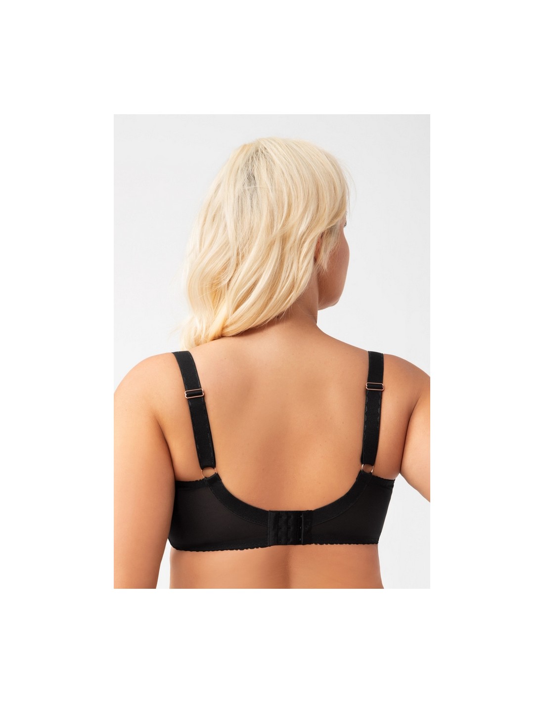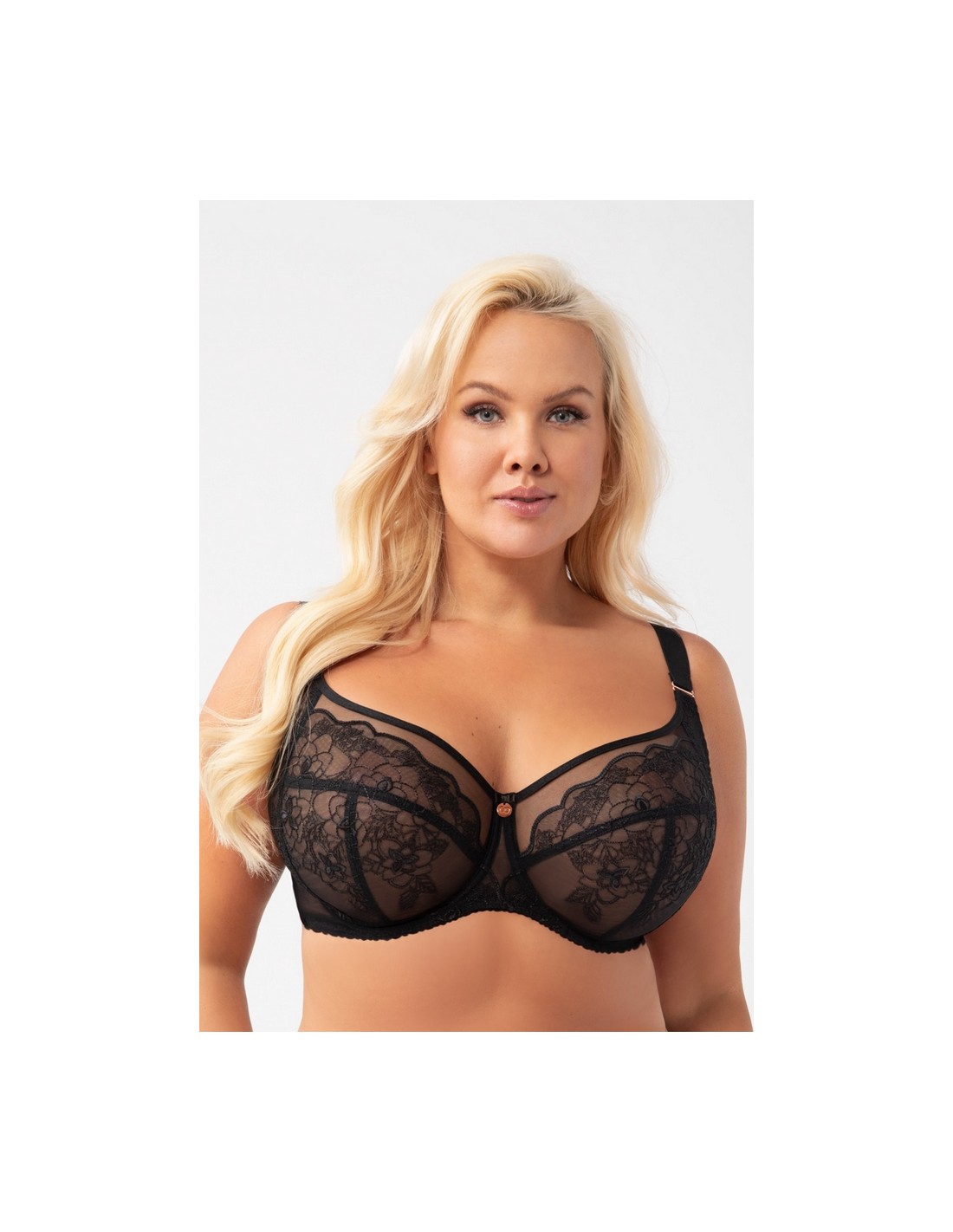Biustonosz miękki przeznaczony dla kobiet ze średnim, dużym oraz bardzo dużym biustem. Zapewnia efekt zaokrąglenia i zebrania biustu do środka,4-częściowe miski z panelem bocznym wykonane z haftu podszytego tiulem stabilnym. Podniesiona linia dekoltu, wykończona delikatnie połyskującą taśmą. Tył z transparentnej lycry zapewniającej doskonałe dopasowanie i podtrzymanie. Fiszbiny boczne zapobiegające zwijaniu się materiału. W zależności od rozmiaru dwu lub trzyrzędowa haftka z trójstopniową regulacją obwodu. Nieodpinane, ramiączka regulowane w czterech szerokościach. Metalowe elementy w kolorze różowego złota (nie zawierają niklu)