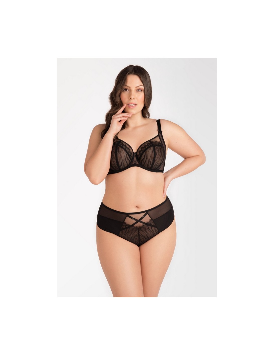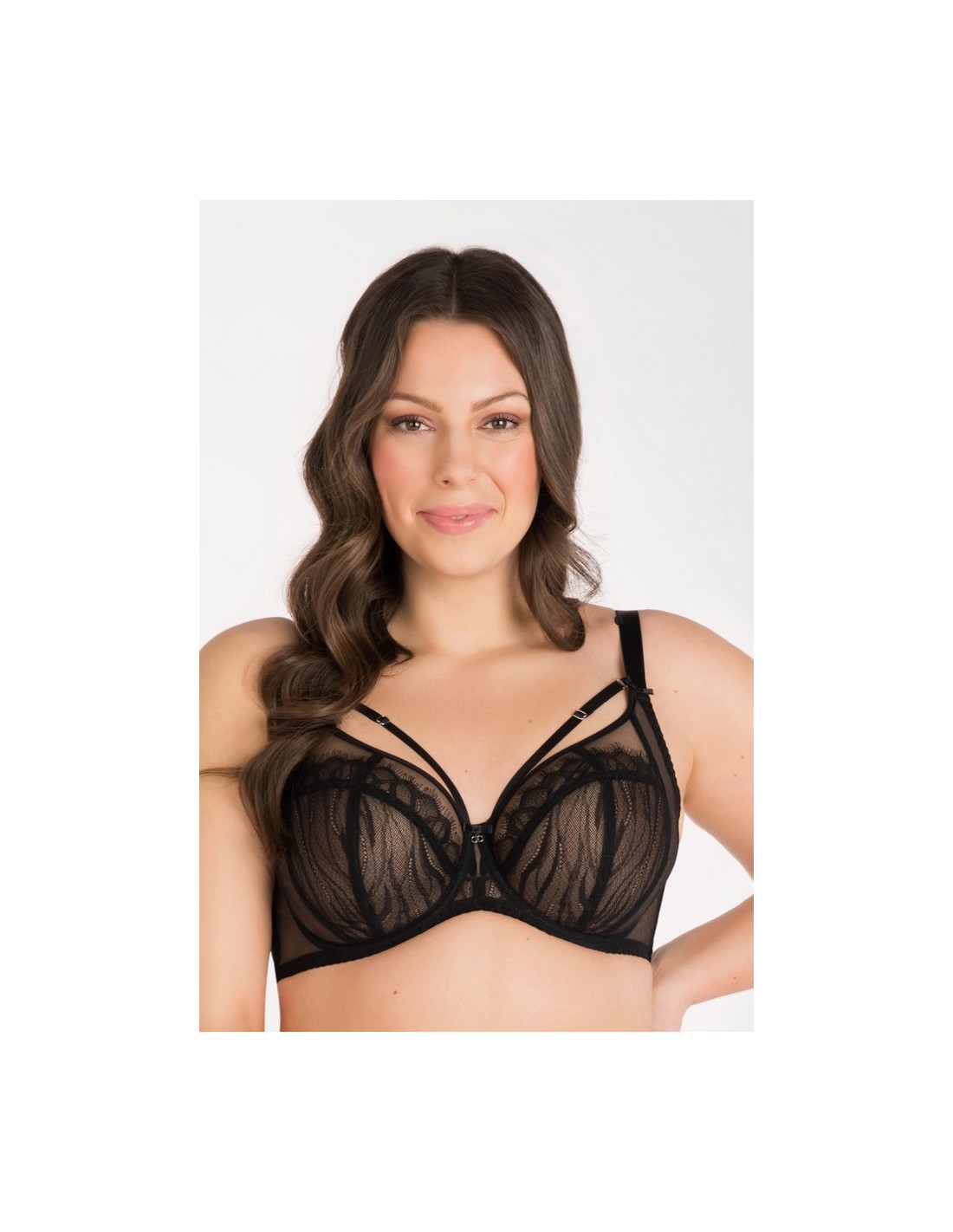 Biustonosz bardzo dobry dla kobiet z pełniejszym biustem. Miseczki podzielone na cztery części: górną, przednią, środkową i boczny panel (side support), co pozwala wyśmienicie zaokrąglić biust i zebrać piersi do środka. Wyższa linia dekoltu jest tak zaprojektowana, aby gwarantować bezpieczne i stabilne dopasowanie, dając poczucie komfortu na co dzień. Ramiączka są dostępne w czterech szerokościach: 14 mm, 18 mm, 22 mm i 25 mm, a zapięcie na haftki posiada regulację w zależności od szerokości ramiączek - dwurzędowe przy 14 mm i trójrzędowe przy szerszych ramiączkach. Miseczki wykonano z połączenia stabilnej koronki i tiulu, co gwarantuje wyśmienite podtrzymanie. Górna krawędź miseczek jest wykończona elastyczną taśmą, a dodatkowe cięcie na górze dodaje delikatnego akcentu. Pas obwodu został uszyty z transparentnej lycry o strukturze siatki, co zapewnia świetne dopasowanie do ciała. Płaskie fiszbiny po bokach sprawiają, że biustonosz jest wygodny i dyskretny. Na dekolcie znajduje się ozdobny pasek z taśmy elastycznej, który można regulować lub odpiąć w zależności od potrzeb.