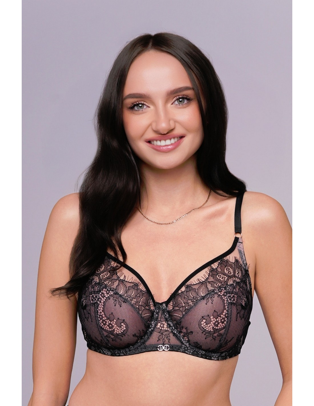 Zmysłowy stanik typu soft na fiszbinach, oparty na sprawdzonej konstrukcji 1396. Model wykonany z cielistej siatki, na którą nałożono efektowną, czarną koronkę otulającą cały biust.
