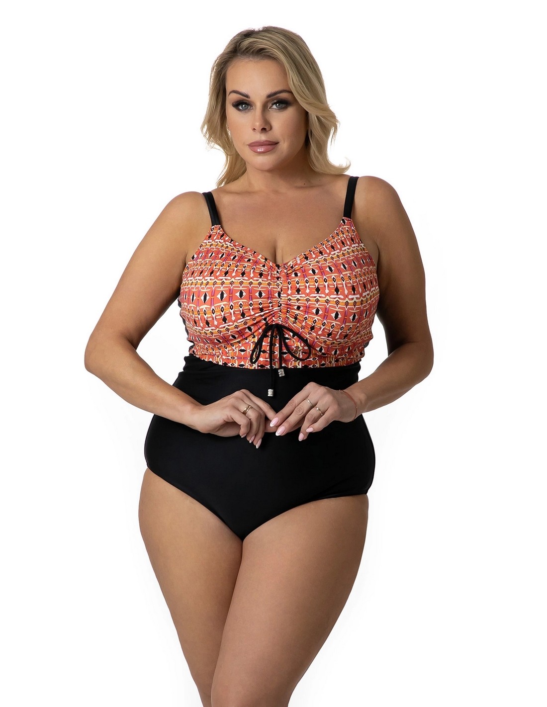 Górna część stroju wykonana jest z eleganckiego drukowanego materiału, który przyciąga wzrok. Usztywniane miski z miękkiej pianki delikatnie modelują biust, a ozdobne marszczenie między piersiami z regulowanym wiązaniem dodaje wdzięku i pozwala na idealne dopasowanie. Dekolt w kształcie litery V subtelnie eksponuje kobiece kształty, podkreślając naturalne piękno.