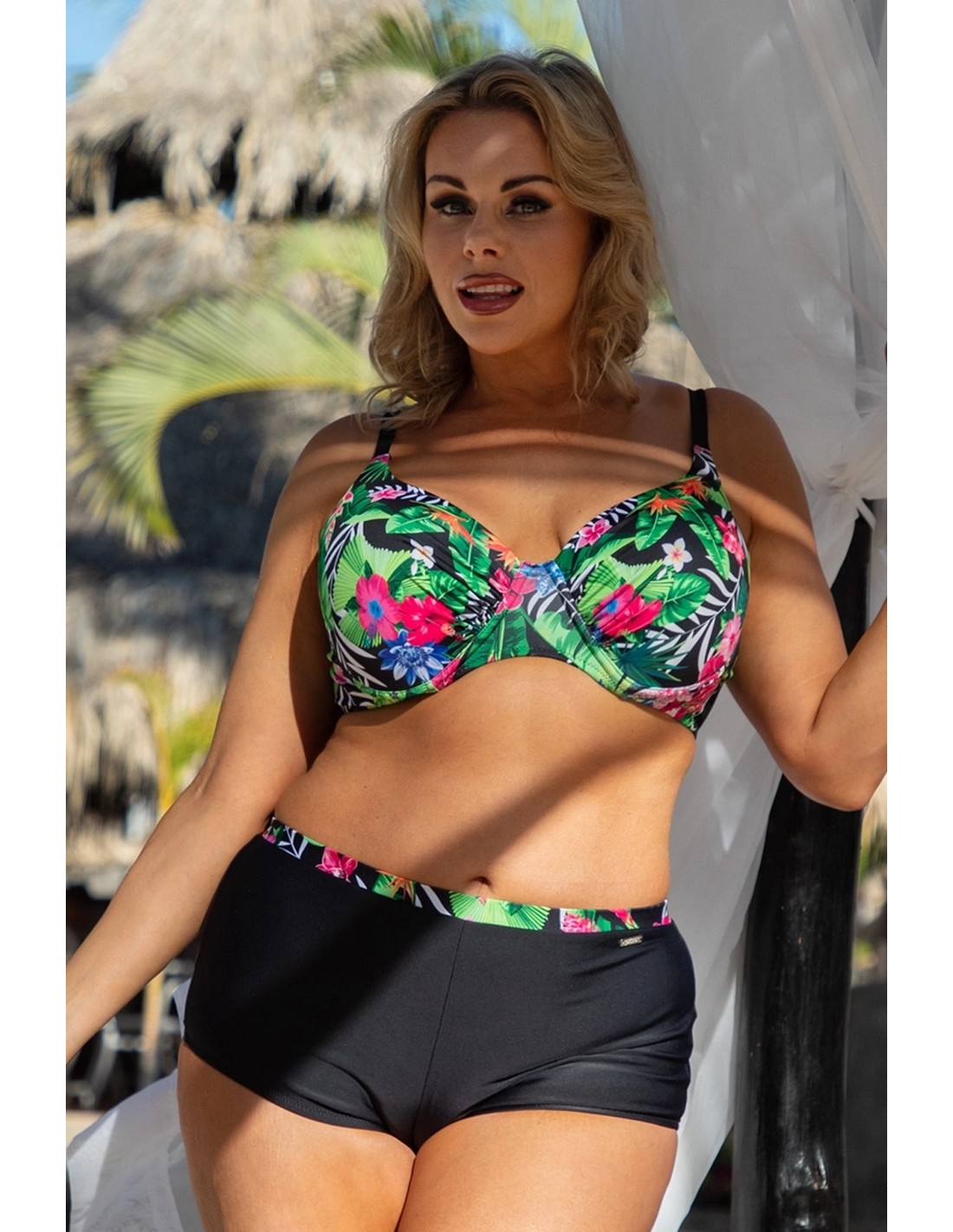 W komplecie znajdziesz zarówno szorty kąpielowe, których przednia część wykonana z podwójnej warstwy materiału, gwarantując komfort i pewne trzymanie. Figi, zasłaniające pupę, są wykończone w górnej części drukowanym paskiem z gumą, nawiązującym do górnej części kostiumu, co tworzy spójny i szykowny wygląd.