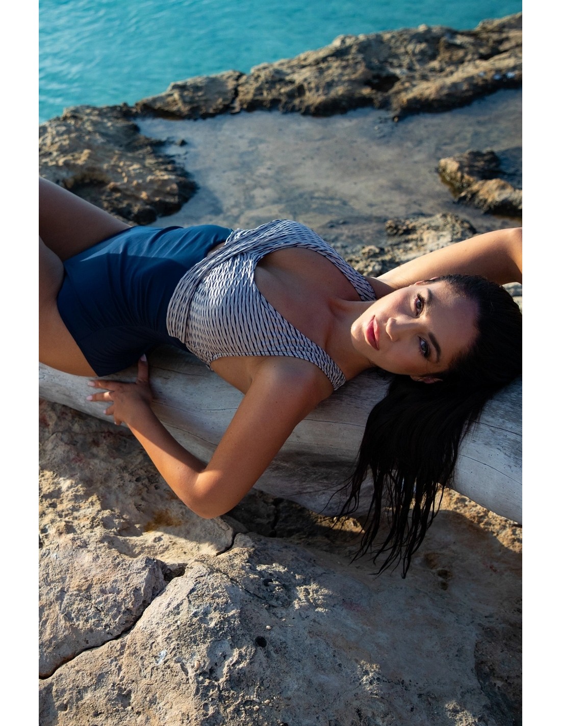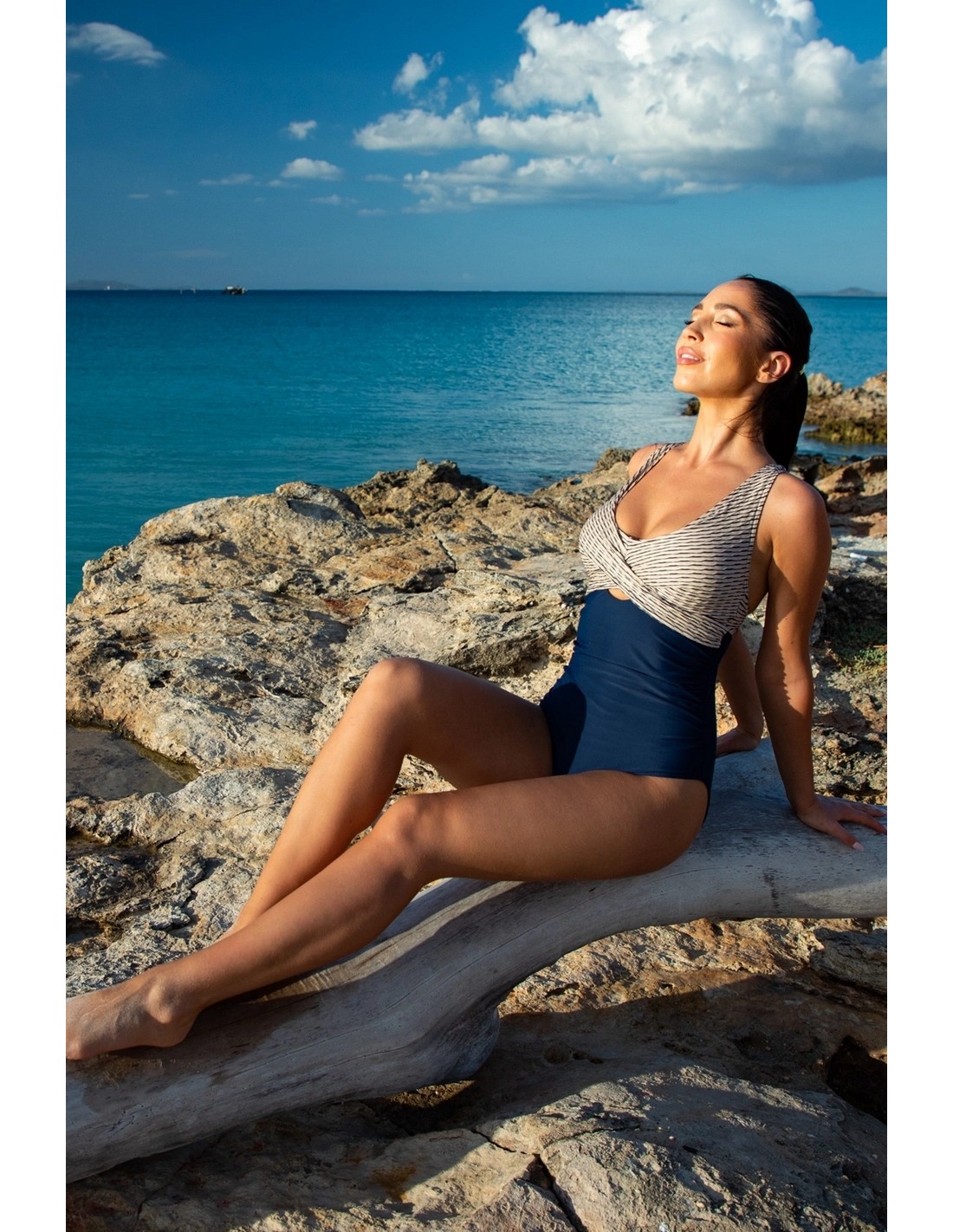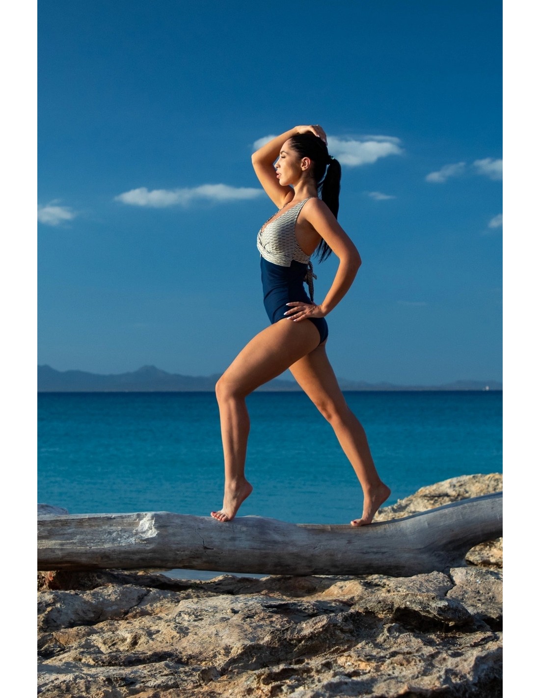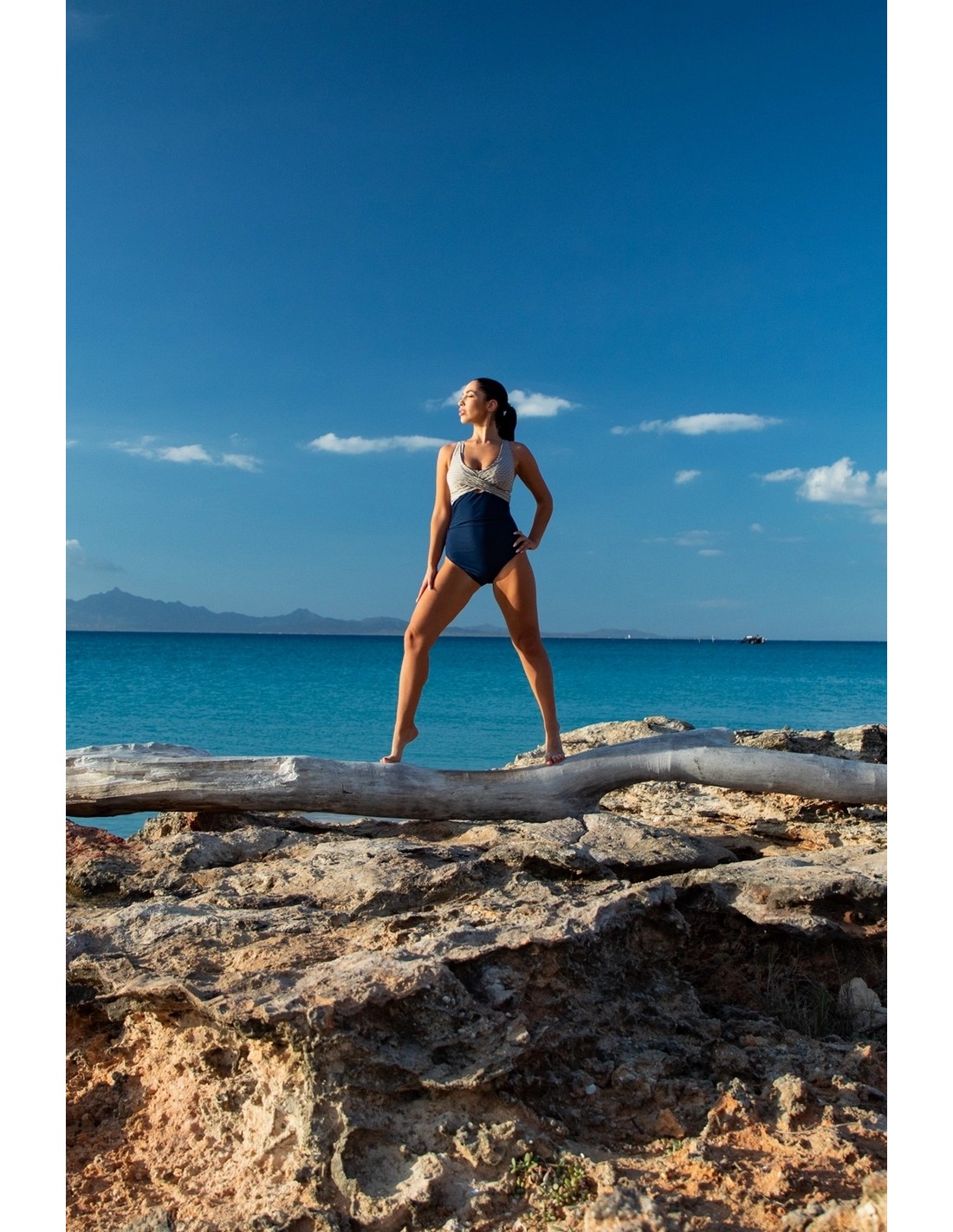 Górna część kostiumu wykonana z luksusowego, piaskowego żakardu w granatowe paseczki, który nadaje całości szykowny wygląd. Dół stroju utrzymany w pasującym granatowym odcieniu znakomicie uzupełnia projekt, tworząc harmonijną całość.