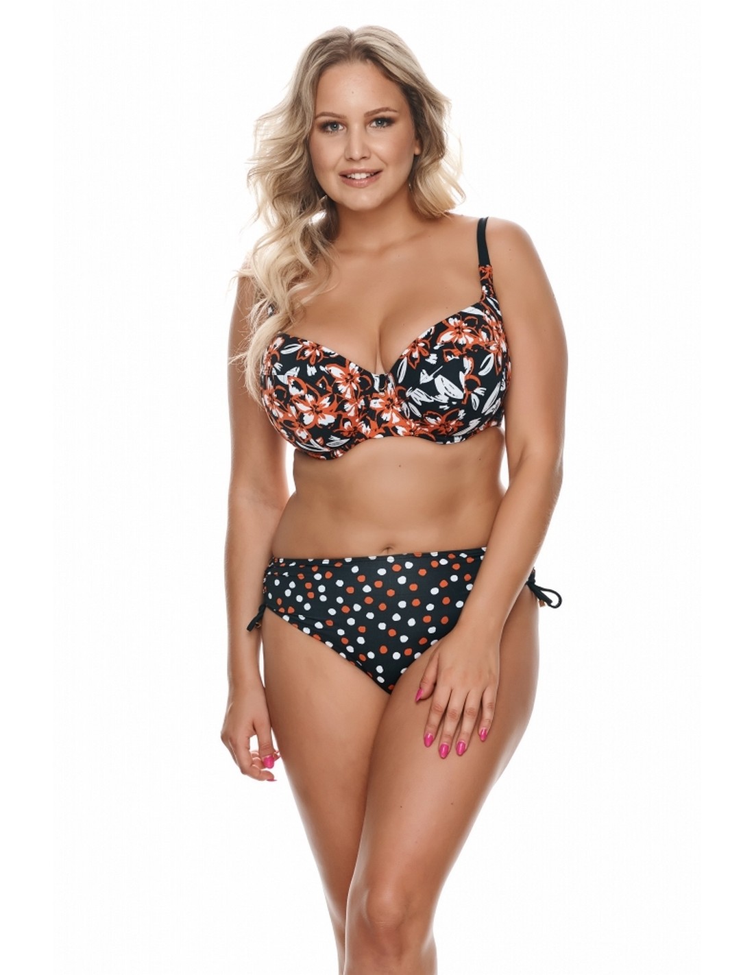 Biustonosz Big Strój Bali Big - Biustonosz bikini, przeznaczony dla kobiet hojniej obdarzonych przez naturę. Biustonosz wykonany jest z dzianiny z kwiecistym motywem, ma miękkie miseczki z modelującymi cięciami oraz jest usztywniony fiszbinami, dzięki czemu wyśmienicie podtrzymuje biust.