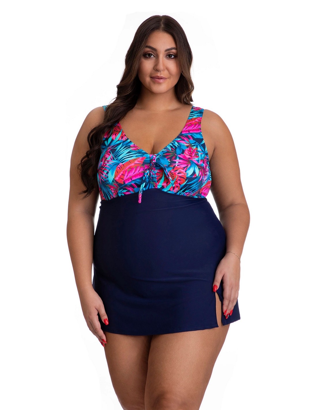 MODEL 5 Model 5 to jednoczęściowy strój kąpielowy a?la sukienka/tunika plażowa. Dolna część stroju (gładka) składa się z dwóch warstw ? pierwsza, przylegająca do sylwetki, to klasyczny jednoczęściowy kostium kąpielowy, natomiast druga, wierzchnia to doszyta warstwa Lycry imitująca sukienkę. Specjalna konstrukcja stroju modeluje sylwetkę, luźny krój spódnicy maskuje brzuch, a delikatny rozporek dodaje elegancji. Górna część stroju uszyta została z drukowanego materiału przez co podkreśla dekolt, ozdobne wiązanie między piersiami. Miski usztywniane delikatną pianką pięknie eksponują piersi, a gumka stabilizująca wszyta pod miskami pozwala na lepsze podtrzymanie, nawet dużego, biustu podczas letnich aktywności. Szerokie ramiączka zapewnią komfort podczas noszenia i nie będą wpijać się w ramiona. Zabudowany tył zakrywa pośladki, co sprawi, że zawsze będziesz czuć się komfortowo i wygodnie! Ten kostium dedykowany jest głownie dla Pań szukających strojów z kolekcji Plus Size, ale idealnie sprawdzi się zarówno dla kobiet w ciąży (pomieści i zakryje ciążowy brzuszek).