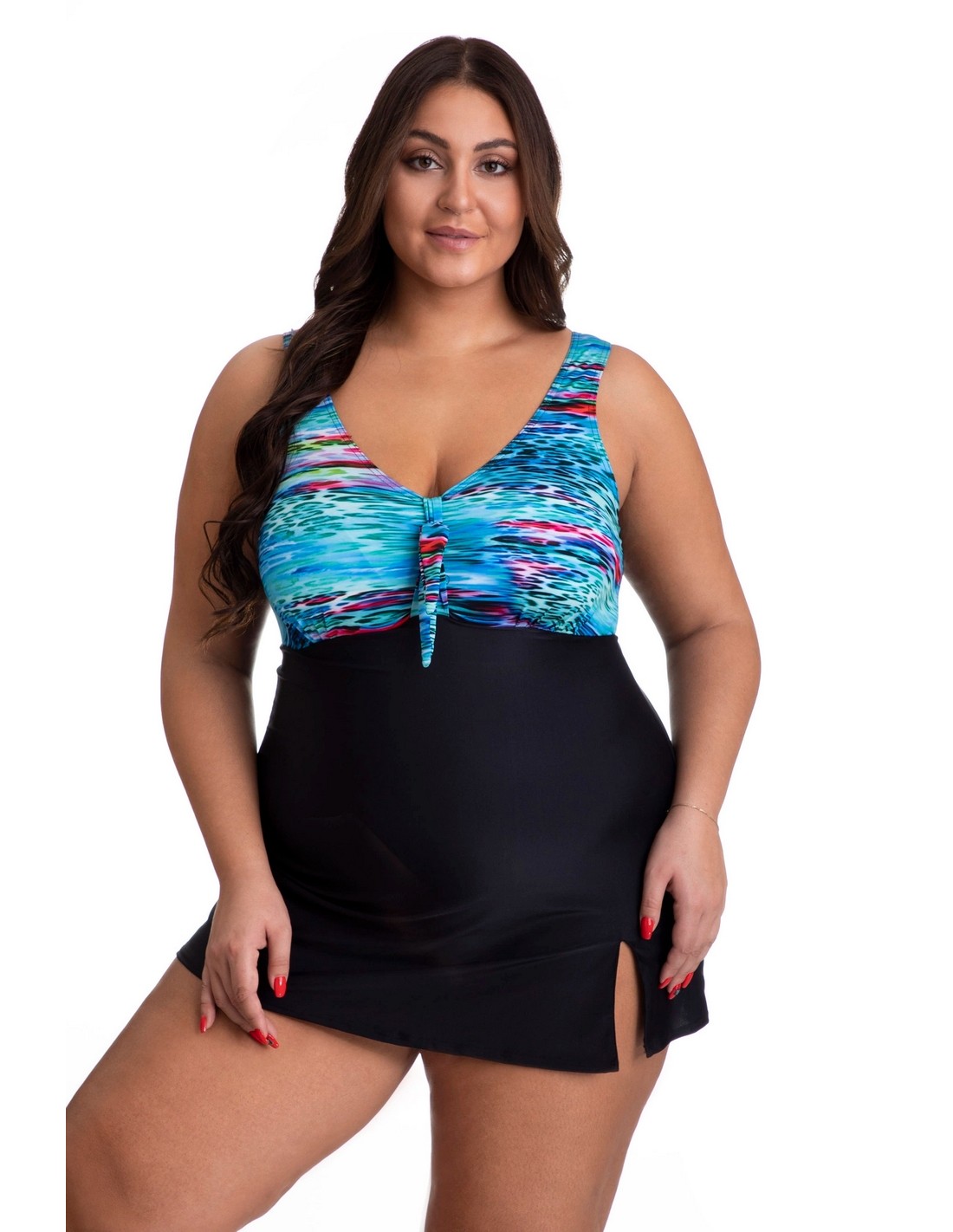 MODEL 5 Model 5 to jednoczęściowy strój kąpielowy a?la sukienka/tunika plażowa. Dolna część stroju (gładka) składa się z dwóch warstw ? pierwsza, przylegająca do sylwetki, to klasyczny jednoczęściowy kostium kąpielowy, natomiast druga, wierzchnia to doszyta warstwa Lycry imitująca sukienkę. Specjalna konstrukcja stroju modeluje sylwetkę, luźny krój spódnicy maskuje brzuch, a delikatny rozporek dodaje elegancji. Górna część stroju uszyta została z drukowanego materiału przez co podkreśla dekolt, ozdobne wiązanie między piersiami. Miski usztywniane delikatną pianką pięknie eksponują piersi, a gumka stabilizująca wszyta pod miskami pozwala na lepsze podtrzymanie, nawet dużego, biustu podczas letnich aktywności. Szerokie ramiączka zapewnią komfort podczas noszenia jak i nie będą wpijać się w ramiona. Zabudowany tył zakrywa pośladki, co sprawi, że zawsze będziesz czuć się komfortowo i wygodnie! Ten kostium dedykowany jest głownie dla Pań szukających strojów z kolekcji Plus Size, ale wyśmienicie sprawdzi się również dla kobiet w ciąży (pomieści i zakryje ciążowy brzuszek).
