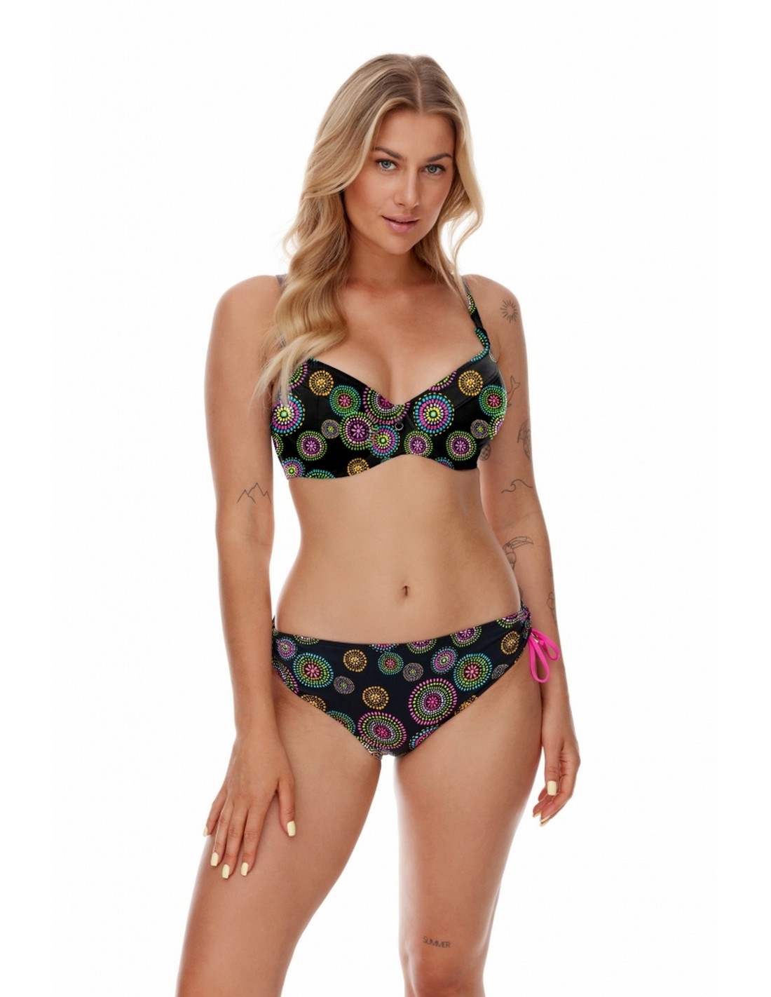 Klasyczne figi bikini z wyższym stanem, wykonane z drukowanej mikrofibry w kolorowym kolisty motywem. Po boczkach ozdobione finezyjnymi troczkami ze złotą ozdobą. Super komfortowy krój.
