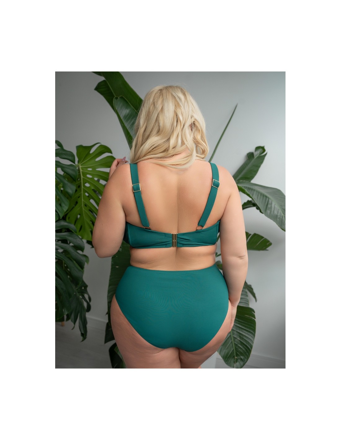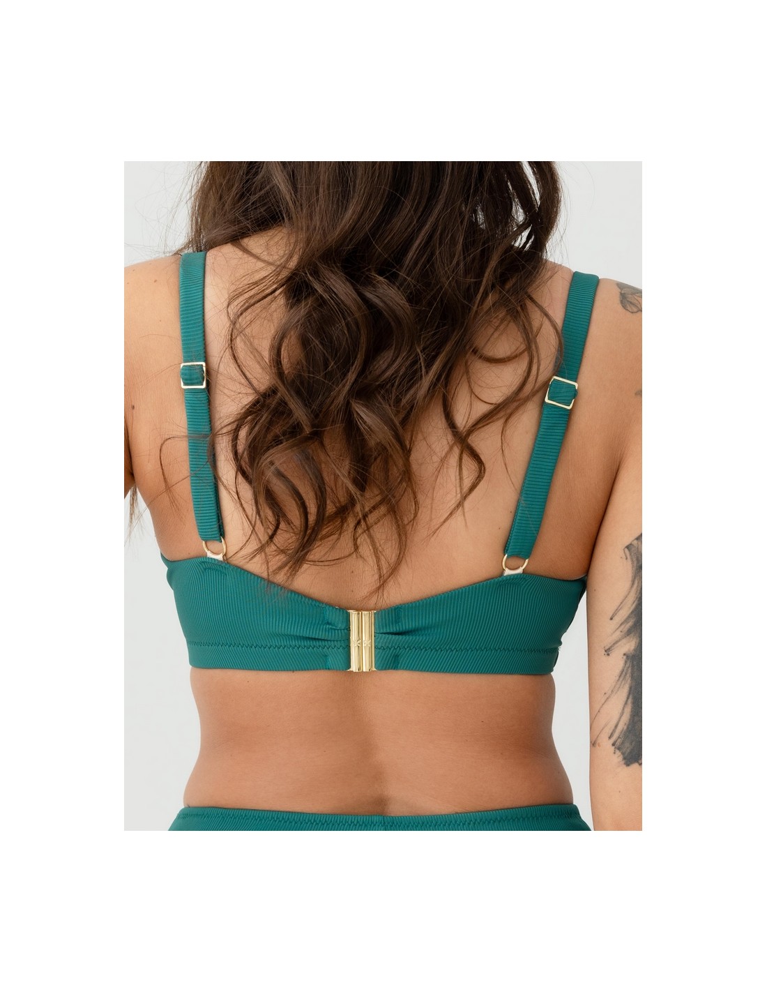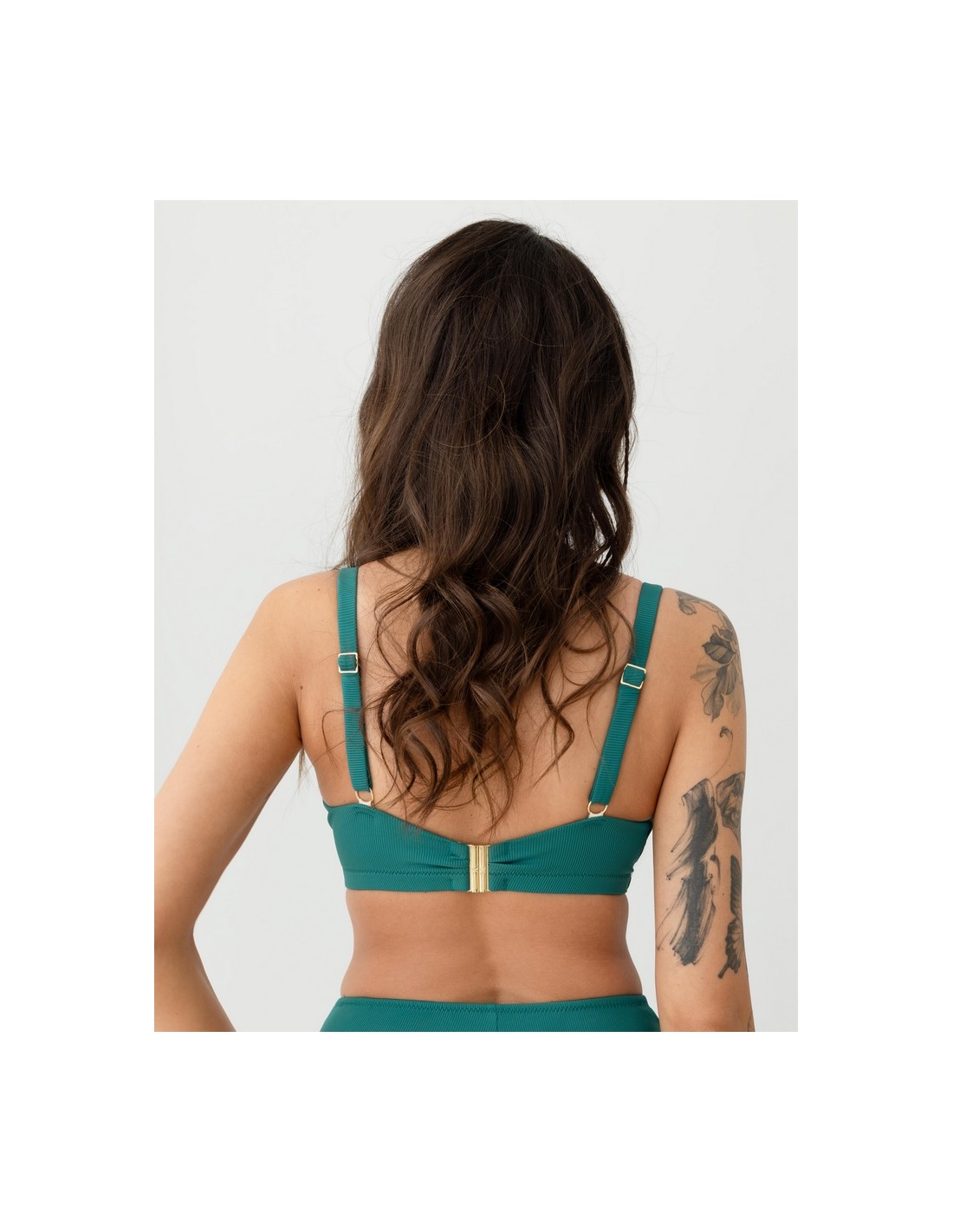 Stanik kąpielowy braletka bikini Krisline Tarifa to idealne połączenie wygody i elegancji, stworzone z myślą o kobietach ceniących naturalne podkreślenie kształtu biustu. Model ten wyróżnia się miękkimi, bezfiszbinowymi miseczkami, które delikatnie otulają piersi, zapewniając komfort nawet w trakcie długiego noszenia. Zapinany na plecach, z nieodpinanymi ramiączkami, które zapewniają stabilność i pewne podtrzymanie. Głęboki zielony kolor oraz subtelne zdobienia dodają mu wyjątkowego charakteru, sprawiając, że świetnie prezentuje się również na plaży, jak i przy basenie. Materiał jest przyjemny w dotyku, szybkoschnący i odporny na działanie chloru oraz promieni UV. Idealny wybór dla pań preferujących naturalny wygląd i pełen komfort, który można łączyć z różnymi modelami fig z tej samej kolekcji Tarifa. Skład: 80% poliamid, 10% elastan, 10% poliester.