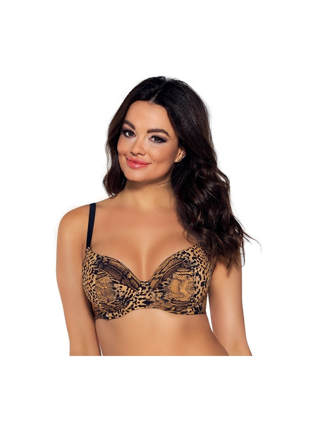 Interesujący biustonosz kąpielowy w modny tego sezonu animal-print. Usztywniane miseczki wyśmienicie obejmują biust, a profilowane fiszbiny pozwalają utrzymać go w odpowiednim miejscu. Stanik kąpielowy zapinany jest z tył na klamerkę ma nieodpinane ramiączka regulowane. Do kompletu dostępne są wygodne figi z wysokim stanem, które optycznie wyszczuplają i podkreślają linię bioder.