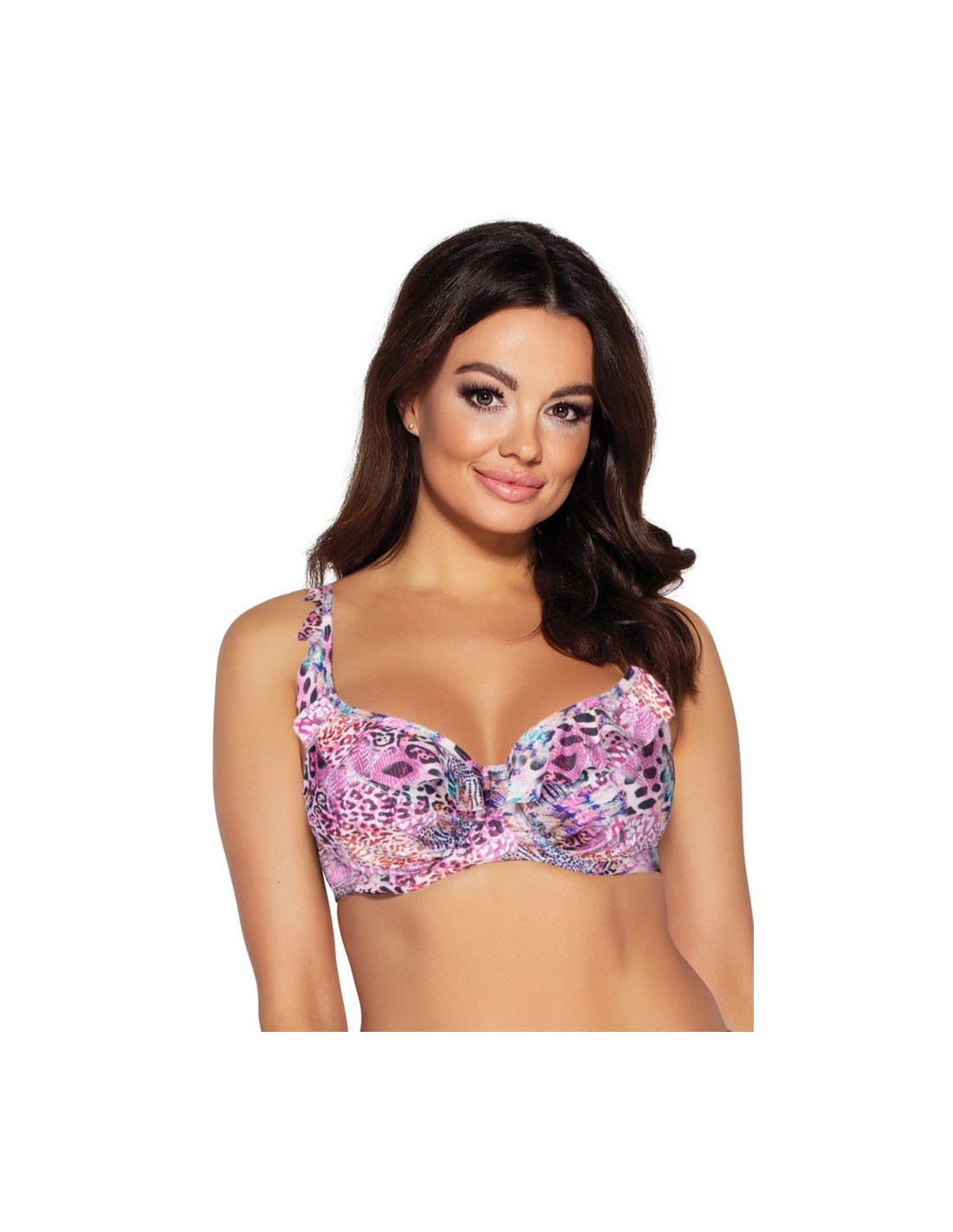 SK 177 PINK to rewelacyjnie kobiecy i szykowny biustonosz kąpielowy. Materiał wysokiej klasy, z którego wykonany jest strój, znakomicie dopasowuje się do ciała, odporny jest na rozciąganie oraz działanie promieni słonecznych.