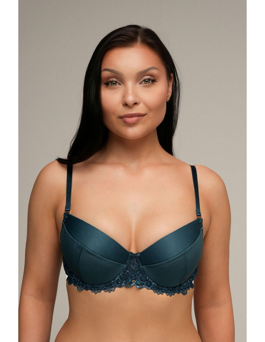 Biustonosz Push-Up z wyjmowaną wkładką to doskonałe rozwiązanie dla pań, które chcą same decydować o intensywności efektu powiększenia i uniesienia biustu. Dzięki miękkim, wyprofilowanym miseczkom oraz fiszbinom biustonosz świetnie podtrzymuje i modeluje piersi, tworząc pięknie zaokrąglony dekolt. Wyjmowane wkładki push-up umożliwiają na dobranie stanika do indywidualnych potrzeb - od delikatnego wymodelowania po mocniejsze podkreślenie biustu. Gustowne wykończenie koronką u dołu oraz subtelny akcent biżuteryjny nadają całości szyku i kobiecego charakteru. Regulowane ramiączka oraz klasyczne zapięcie na haftki gwarantują pełen komfort i idealne dopasowanie.