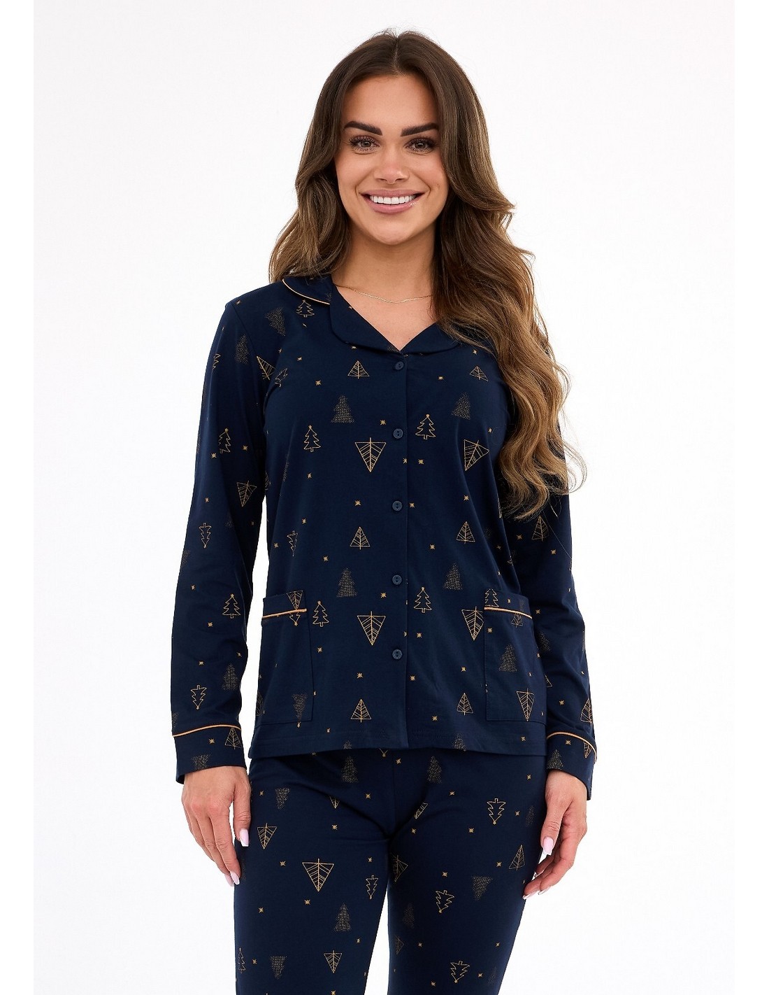Piżama damska DR 482/447 GOLD marki Cornette to bardzo dobre połączenie elegancji, wygody i klasy. Wykonana z delikatnej, 100% bawełny, jest przyjazna dla skóry i bardzo dobra do noszenia przez cały rok. Koszula z długim rękawem, eleganckim kołnierzykiem i zapięciem na guziki dodaje klasycznego wdzięku, a długie spodnie z prostymi nogawkami i kieszeniami gwarantują pełen komfort noszenia. Zapakowana w estetyczne pudełko, będzie perfekcyjnym wyborem również na prezent - dla siebie lub bliskiej osoby.