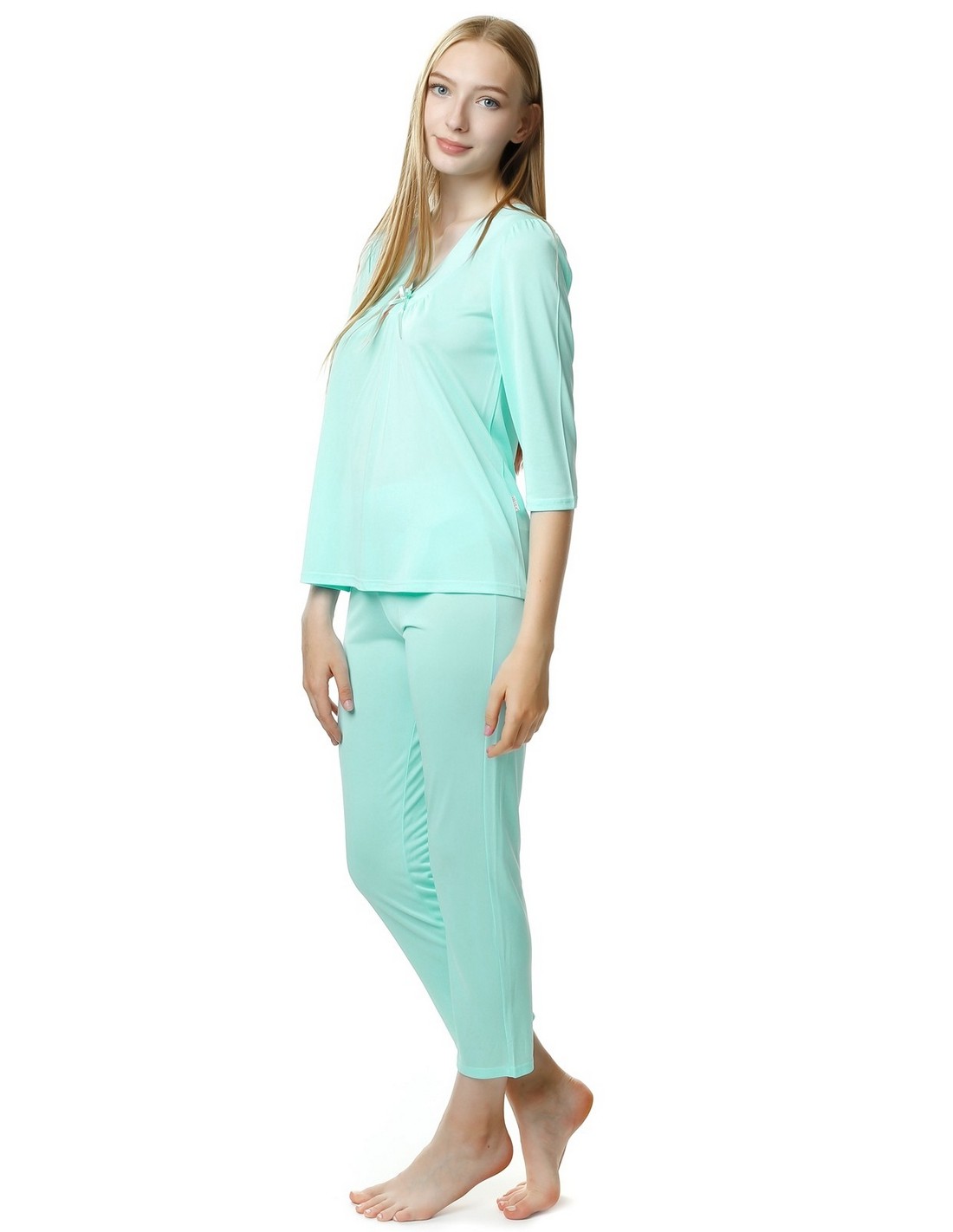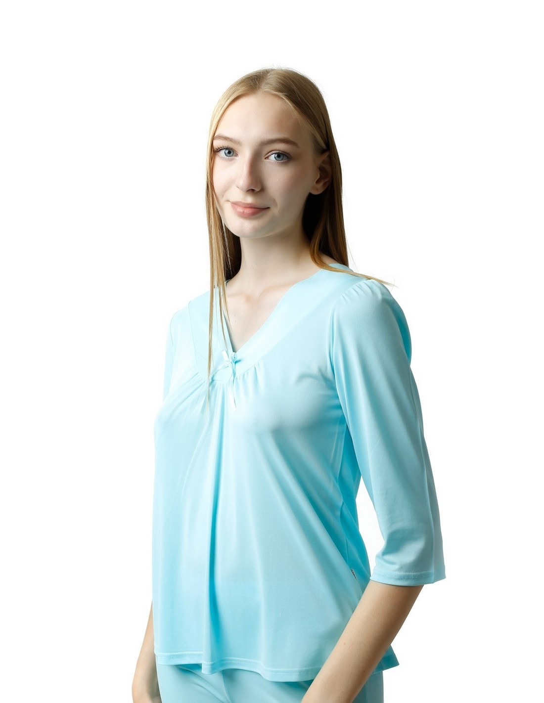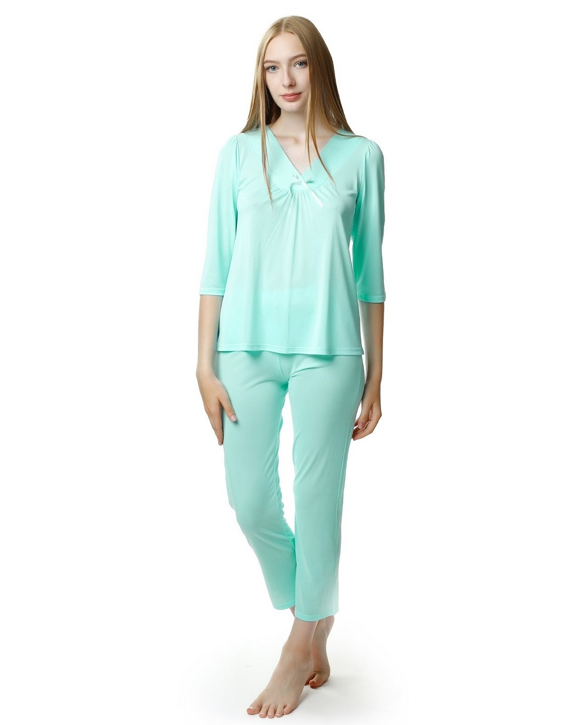 Dwuczęściowa piżama damska Consuela z jedwabiu wiskozowego. Piżama posiada koszulkę z rękawem o długości 3/4 oraz gustowną kokardkę przy dekolcie.