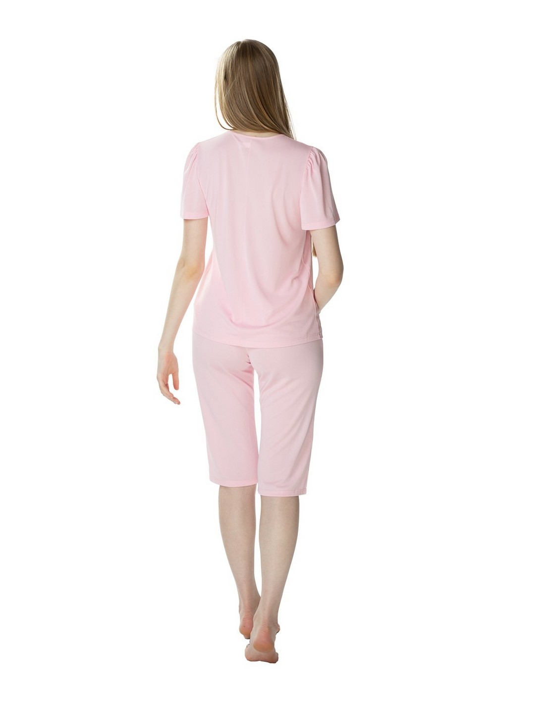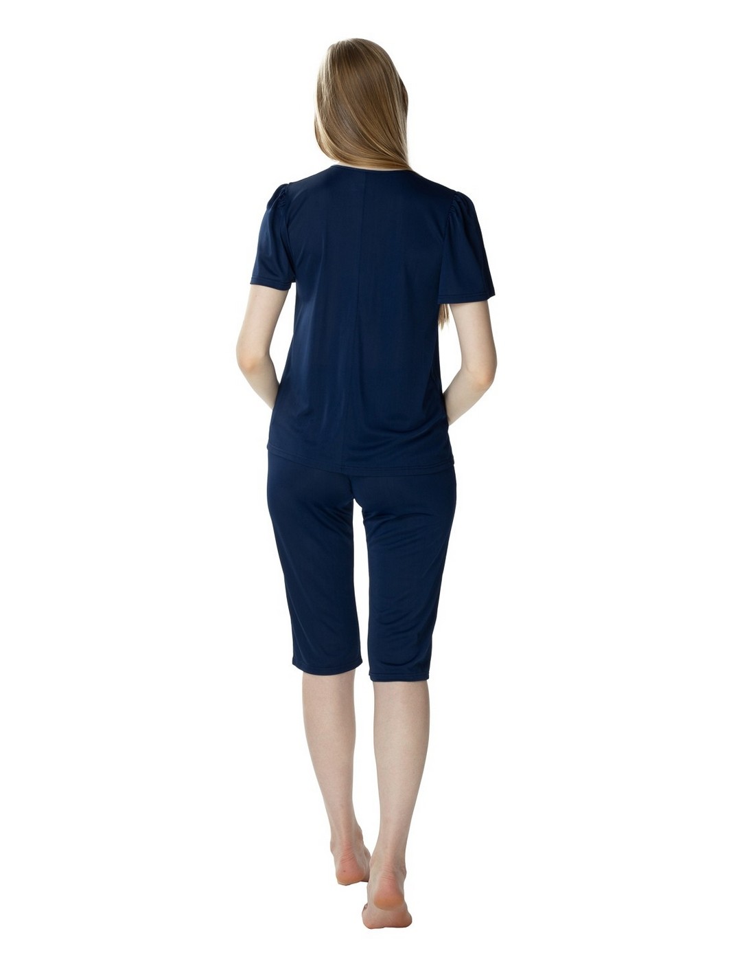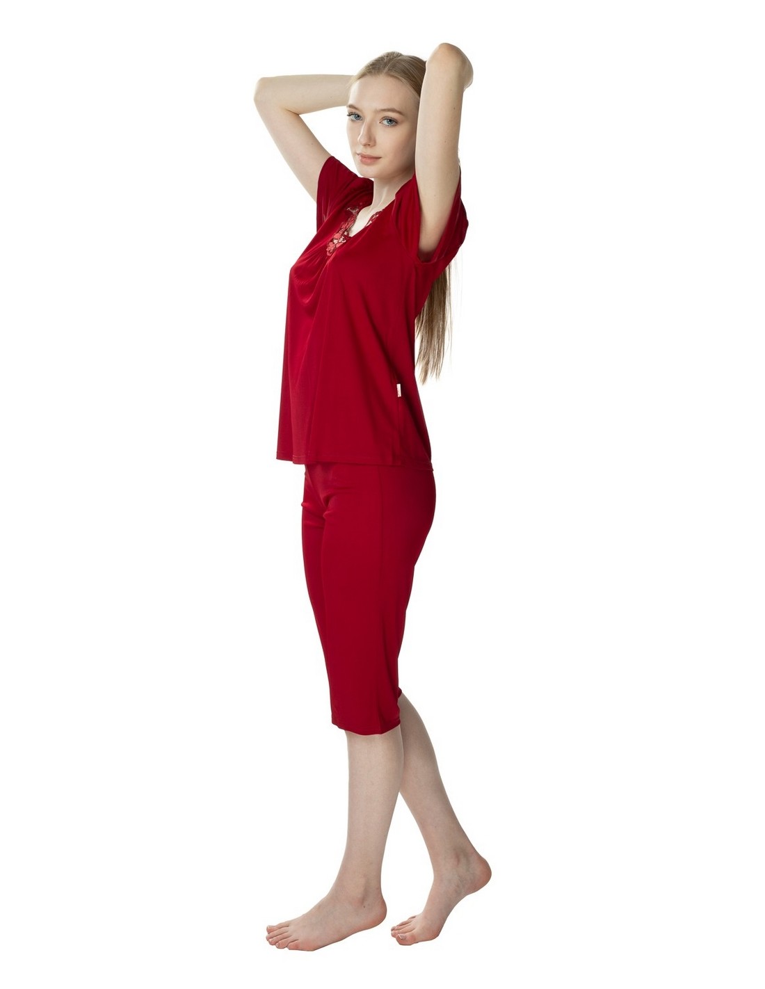 Piżama Matylda to klasyka połączona z piękną kwiatową gipiurą umieszczoną na dekolcie. Koszulka Matyldy posiada luźny krój, krótki rękawek, a zaokrąglony dekolt zdobi piękna gipiura. Spodnie na gumce mają klasyczny i prosty krój. Długie do kolan spodnie sprawdza się dla wszystkich kobiet, które nie przepadają za długimi spodniami od piżamy. Matylda to wyśmienity wybór nie tylko na letnie noce.