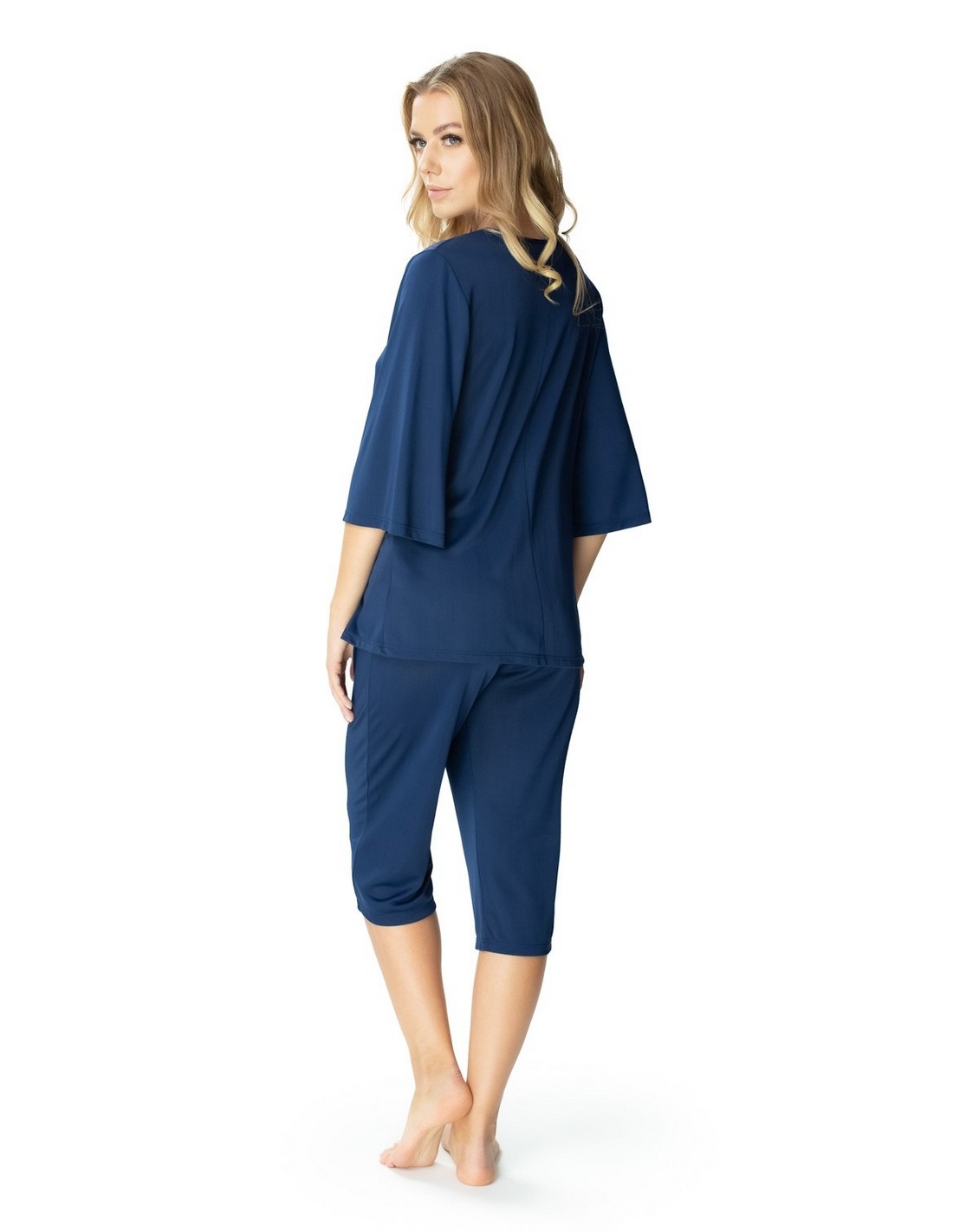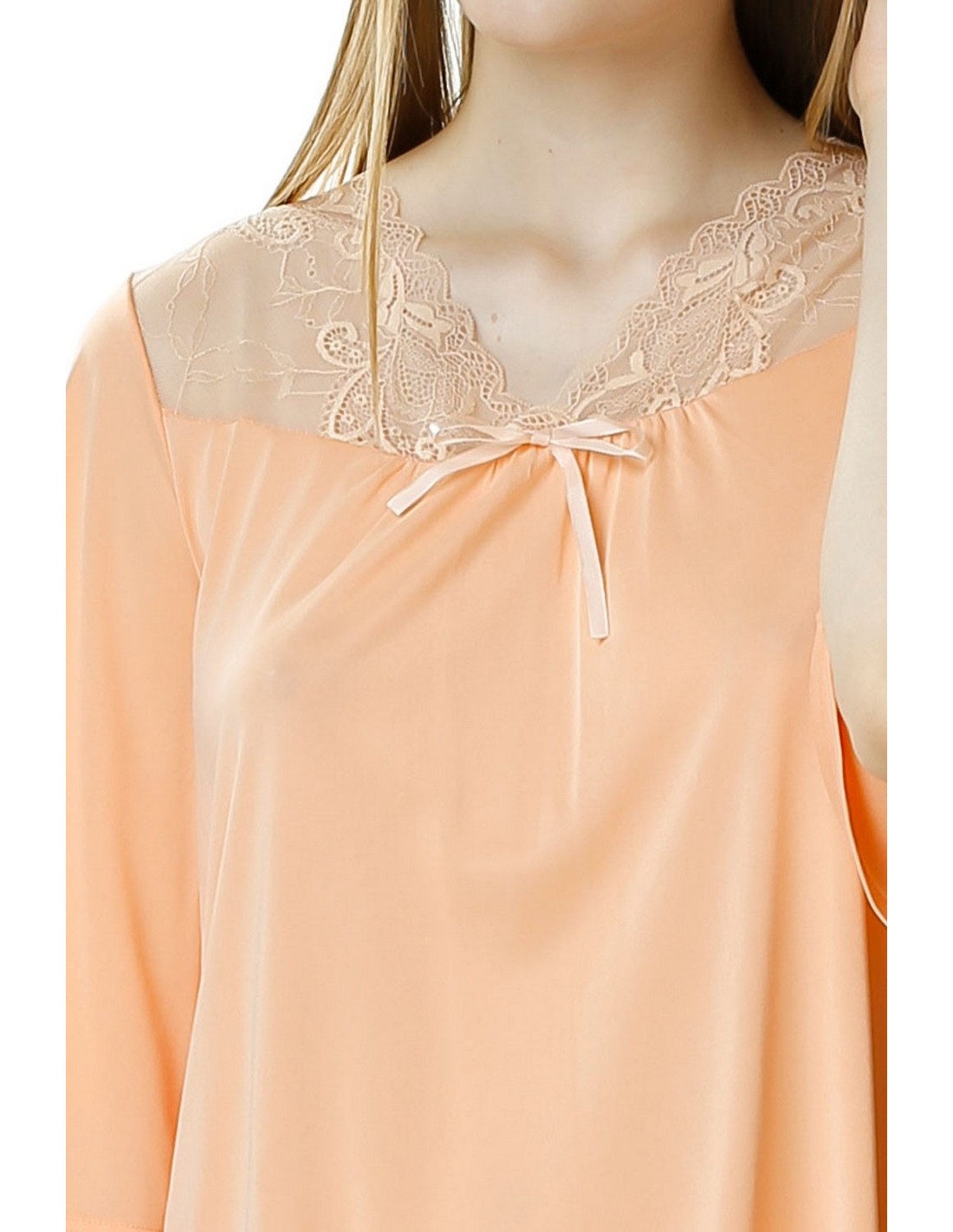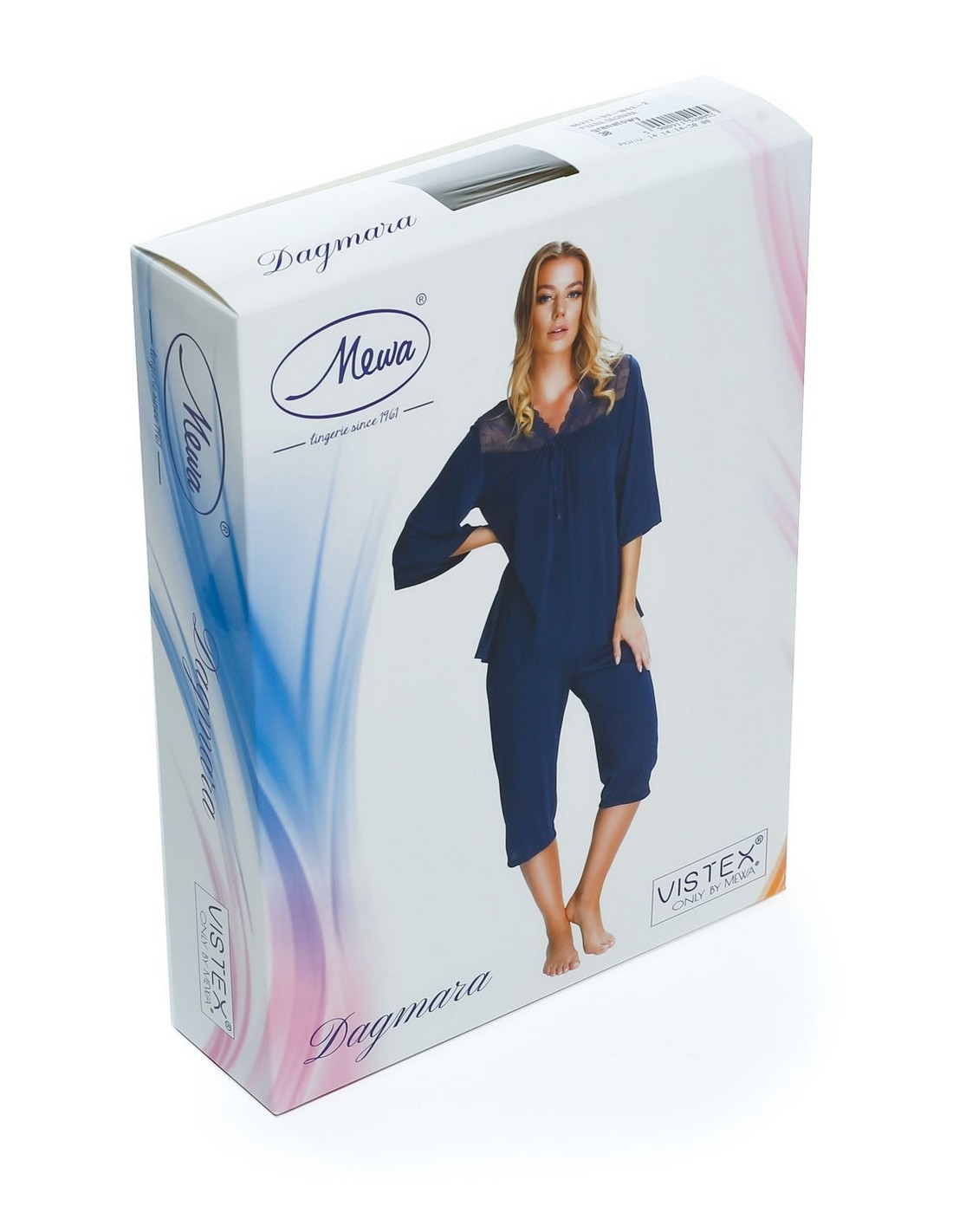 Piżama damska dwuczęściowa Dagmara z koronką na dekolcie. Koronkową, przezroczystą wstawkę dodatkowo zdobi satynowa kokardka. Piżamę wyróżnia lekkość i wygoda użytkowania. Materiał dobrze się układa. Rękawy a także nogawki mają długość 3/4. Piżama sprawdzi się wyśmienicie o każdej porze roku.