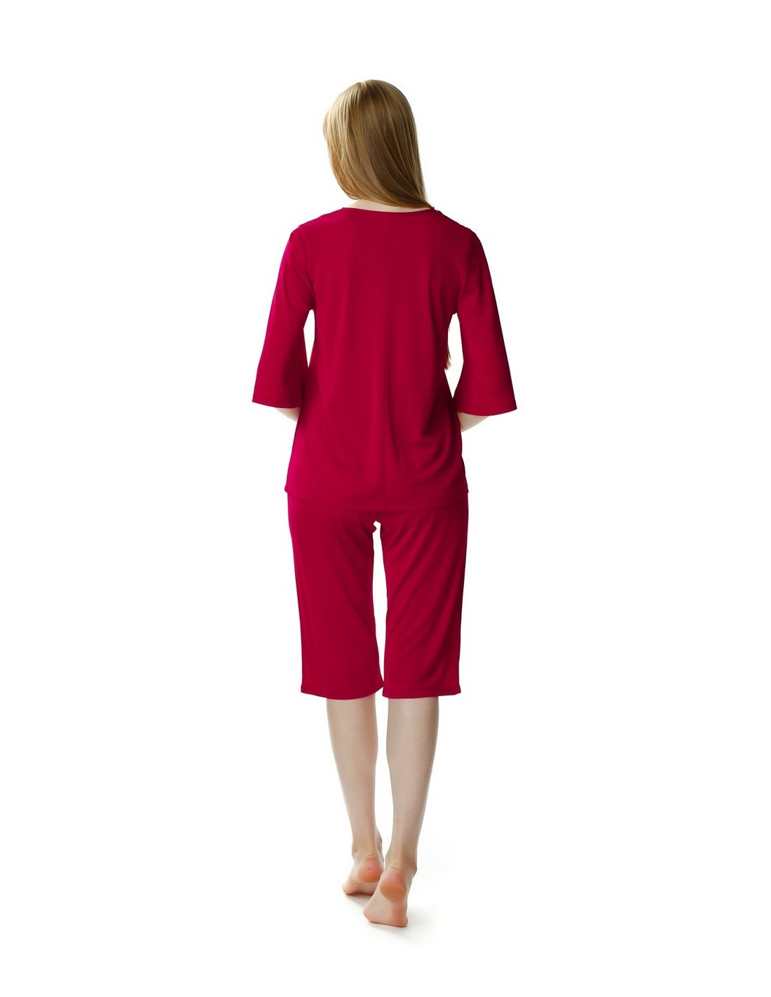 Materiał, z którego wykonano piżamę to wysokiej klasy jedwab wiskozowy charakteryzujący się takimi właściwościami jak: termoaktywność, higroskopijność, antybakteryjność, antyalergiczność oraz wysoka przepuszczalność potu. Jedwab wiskozowy nie elektryzuje się, nie przykleja do ciała, nie uczula i nie podrażnia nawet najbardziej wrażliwej skóry.
