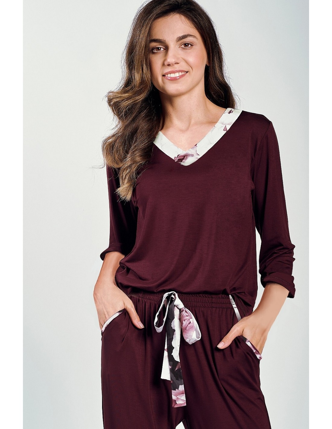 Piżama damska z rękawem długości 3/4, dekolt w serek, obszyty kontrasującym materiałem. Do kompletu spodnie długości 7/8 z prostymi nogawkami i kieszeniami. W pasie ozdobny troczek.