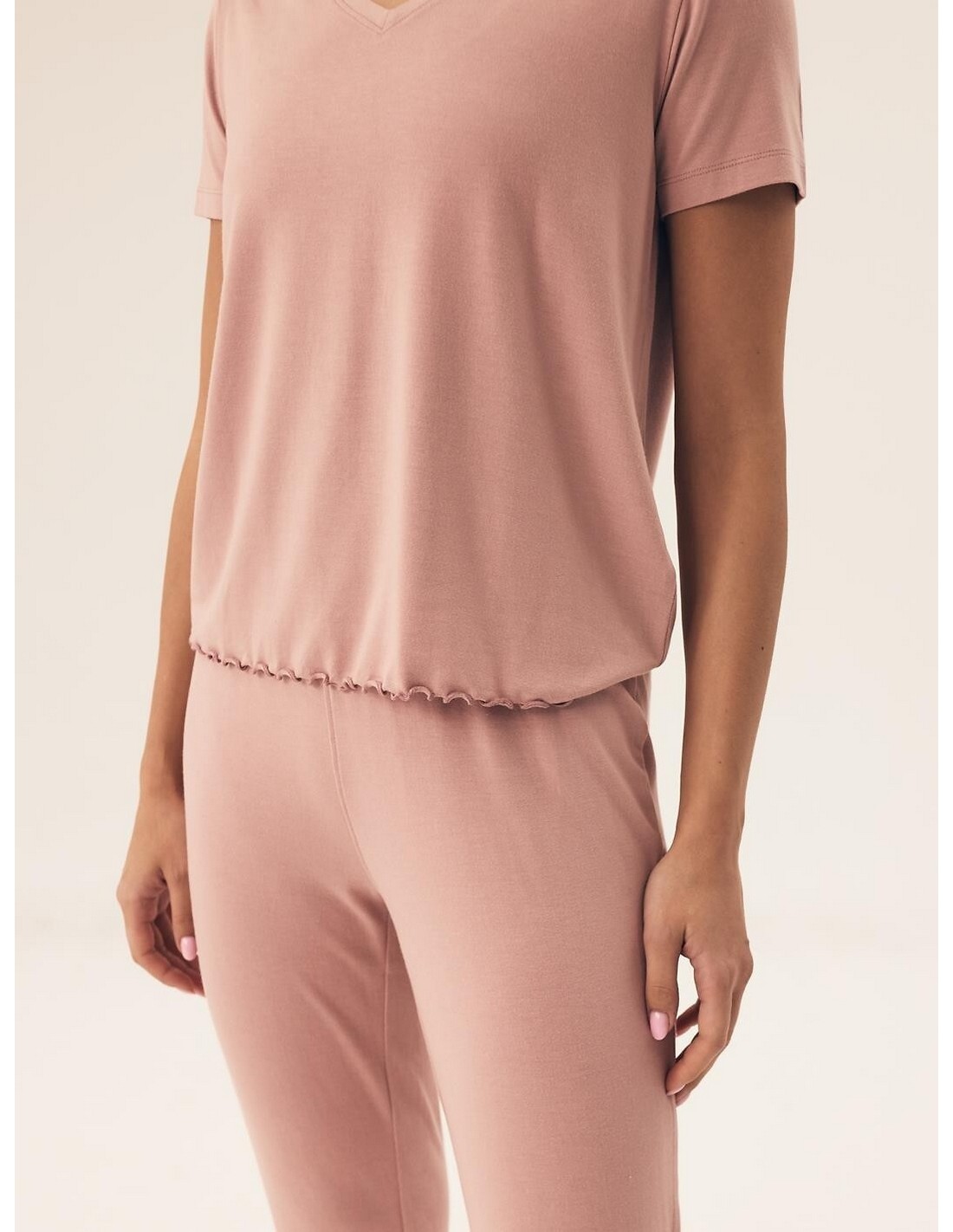 Gładka piżama damska wykonana jest z delikatnej wiskozy, bluzka z krótkim rękawem, niepodwinięty dół obszyty overlockiem tworzy naturalną falbankę, dekolt w kształcie V, spodnie długie, nogawka zwężana wykończona overlockiem. Skład: 95% Wiskoza, 5% Elastan