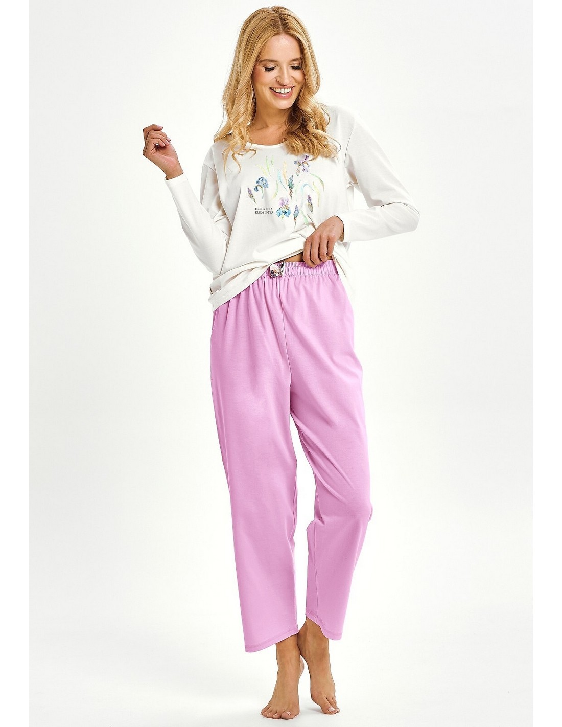 Długa piżama damska MONICA 3459 to bardzo dobra propozycja dla kobiet, które cenią sobie komfort snu i subtelny, kobiecy styl. Wykonana z delikatnej, 100% bawełny, znakomicie otula ciało, zapewniając wygodę przez całą noc. Koszulka jest z długim rękawem udekorowana została kolorowym, kwiatowym nadrukiem z przodu, a długie spodnie w kontrastującym kolorze dodają zestawowi nowoczesnego charakteru. W pasie znajduje się miękka gumka oraz ozdobna kokardka, które gwarantują świetne dopasowanie i estetyczne wykończenie.