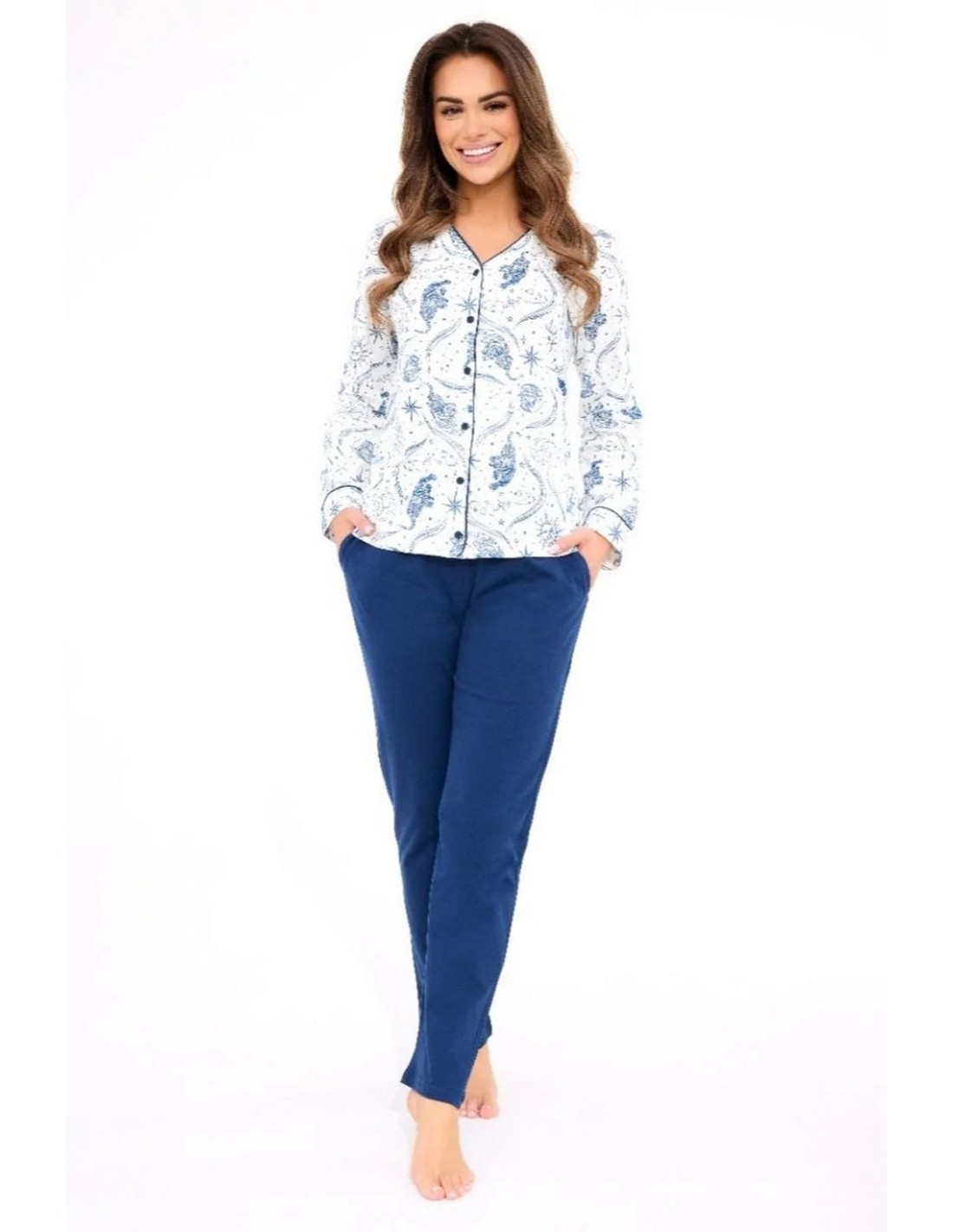 Piżama damska z wysokiej jakości bawełny, koszulka z długim rękawem, ozdobiona printem, zapinana na guziki, jednolite, długie spodnie. Skład: 100% bawełna