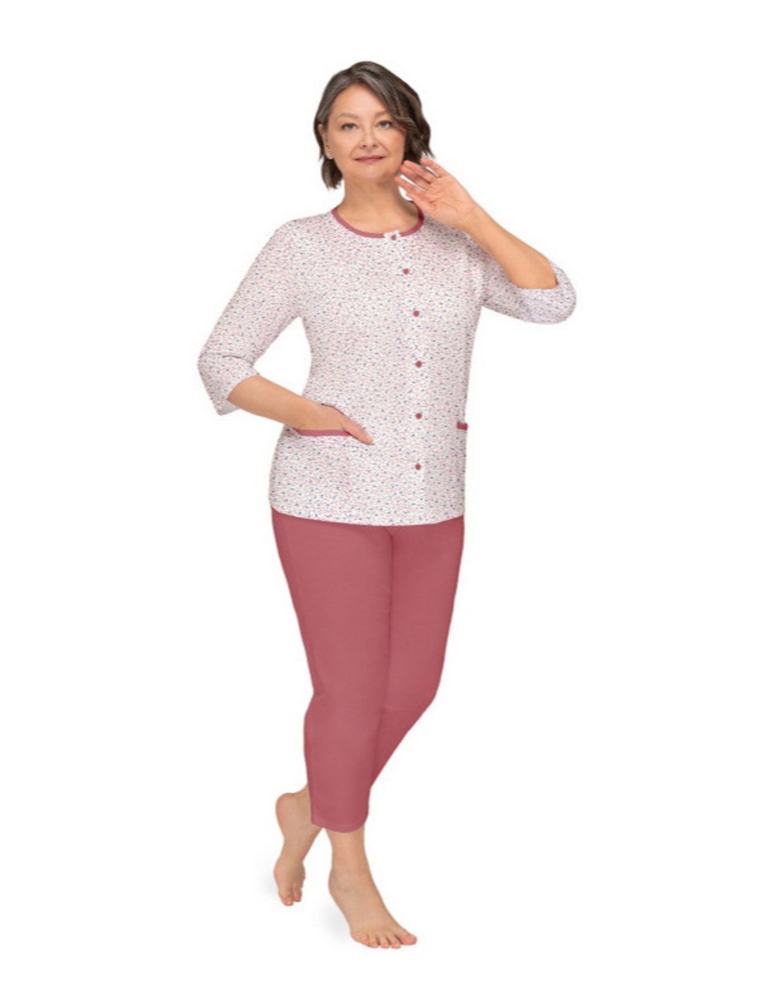 Piżama damska KASIA II 266 to komfortowy komplet stworzony z myślą o kobietach ceniących praktyczne rozwiązania i naturalne materiały. Uszyta z 100% bawełny, jest miękka, przewiewna i przyjazna dla skóry. Bluzka z rękawem 3/4, okrągłym dekoltem i dwiema kieszeniami jest w pełni rozpinana, co sprawia, że doskonale sprawdza się również dla mam karmiących. Spodnie o długości 7/8 z elastyczną gumką w pasie gwarantują komfortowe dobranie. Polski producent zapewnia wysoką klasa wykonania.