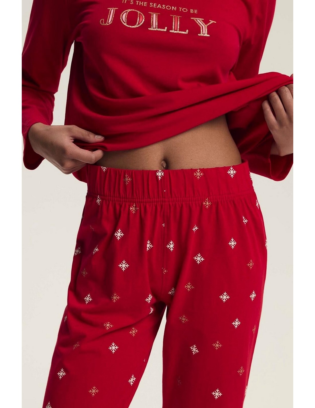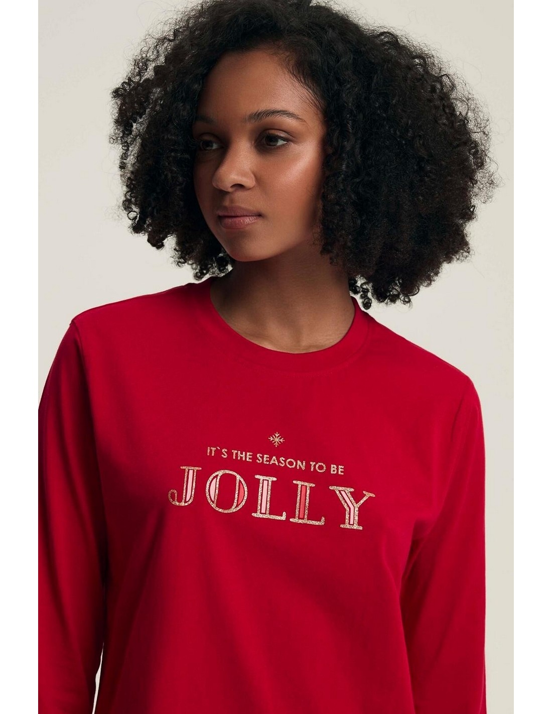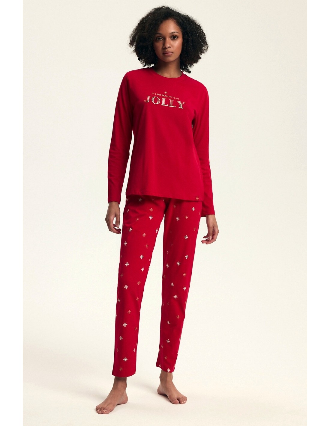 Świąteczna piżama damska, koszulka z długim rękawem, dekolt okrągły, przód z ozdobnym złotym nadrukiem, do kompletu długie,wzorzyste spodnie, w pasie szeroka, elastyczna gumka, pakowana w foliowy woreczek. Skład: 100% bawełna