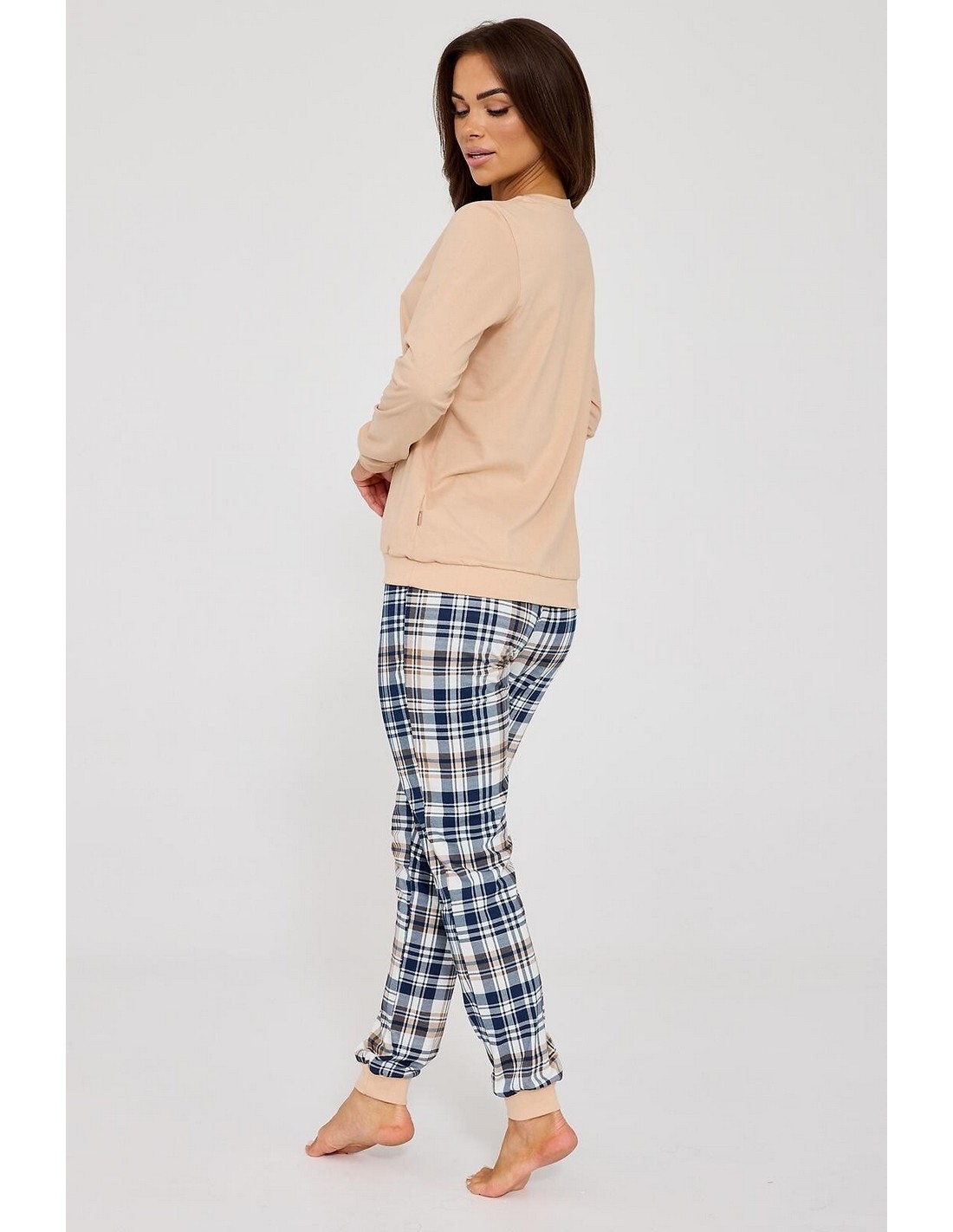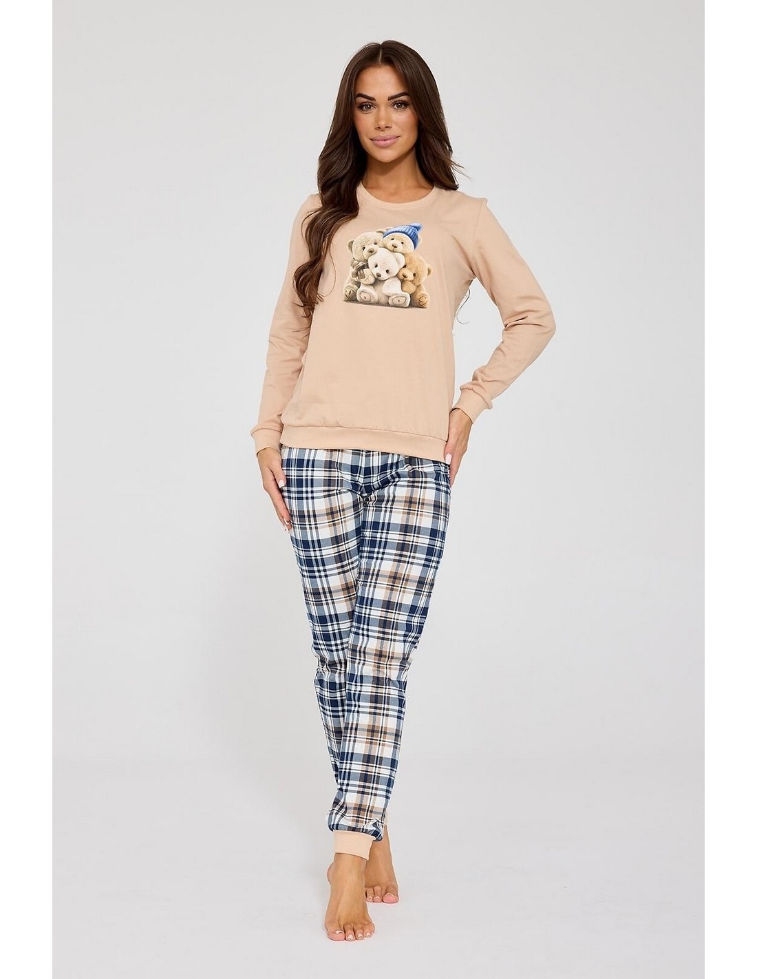 Piżama damska DR 671/425 BEARS to połączenie wygody i uroczego designu. Wykonana z wysokiej klasy, miękkiej bawełny, zapewnia komfort snu i relaksu w domowym zaciszu. Koszulka jest z długim rękawem i okrągłym dekoltem udekorowana jest kolorowym nadrukiem z przodu, dodającym jej przytulnego charakteru. Do kompletu dołączone są długie spodnie w modny wzór kratki. Zarówno rękawy, jak i nogawki oraz dół bluzy wykończone są praktycznymi ściągaczami, które zwiększają wygodę noszenia. Piżama pakowana jest w szykowne pudełko, dzięki czemu sprawdzi się również jako prezent.