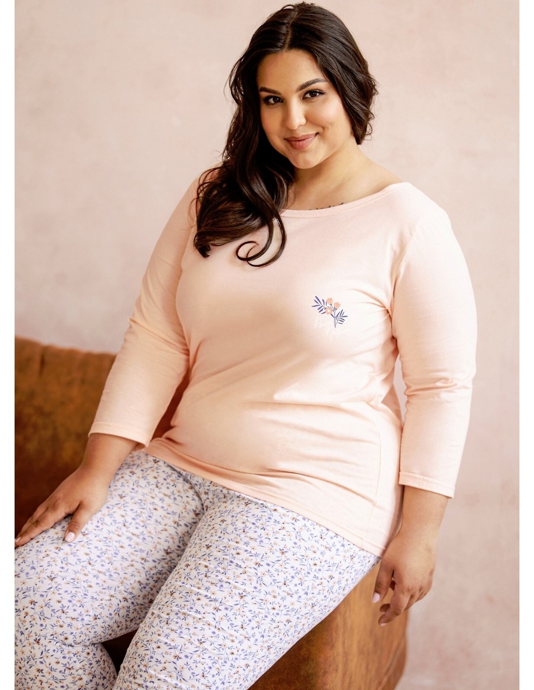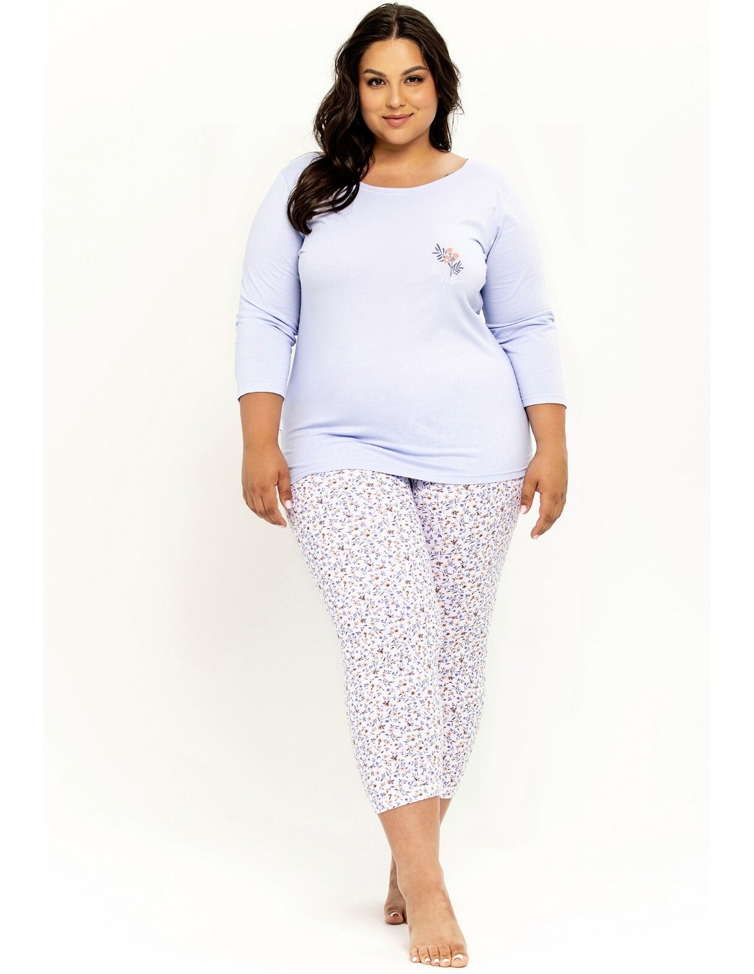 Piżama damska z rękawem długości 7/8, jednolita, na wysokosci klatki piersiowej nadruk. Do kompletu wzorzyste spodnie długości 7/8.