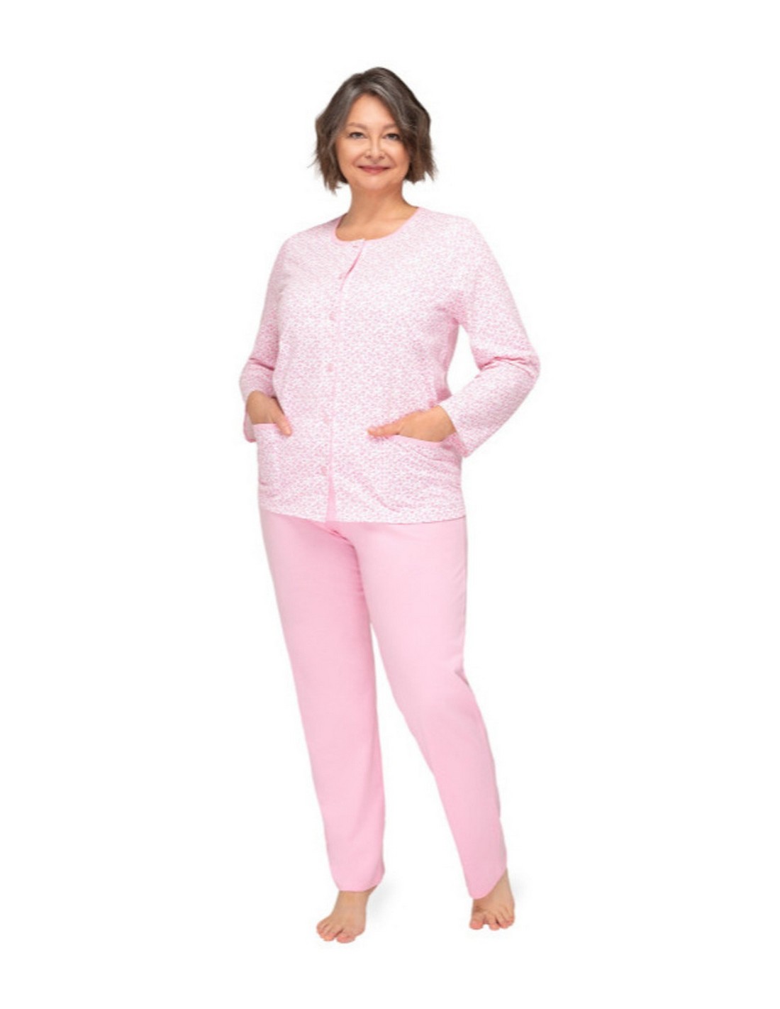 Piżama damska Kasia 267 to świetne połączenie komfortu i elegancji na każdą porę roku. Wykonana w 100% z wysokiej jakości bawełny, jest miękka, przewiewna i przyjazna dla skóry. Koszulka z długim rękawem, wzorzystym designem i okrągłym dekoltem gwarantuje szykowny wygląd, a pełne rozpinanie na guziki ułatwia zakładanie. Jednolite, długie spodnie z wygodną gumką w pasie zapewniają swobodę ruchów i bardzo dobre dobranie. To świetny wybór dla pań ceniących wygodę i klasyczny styl!