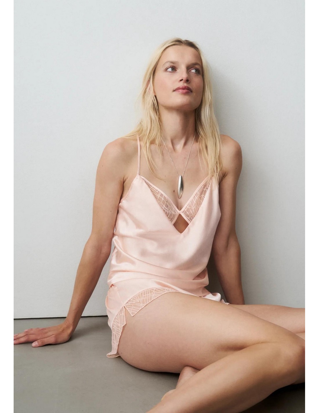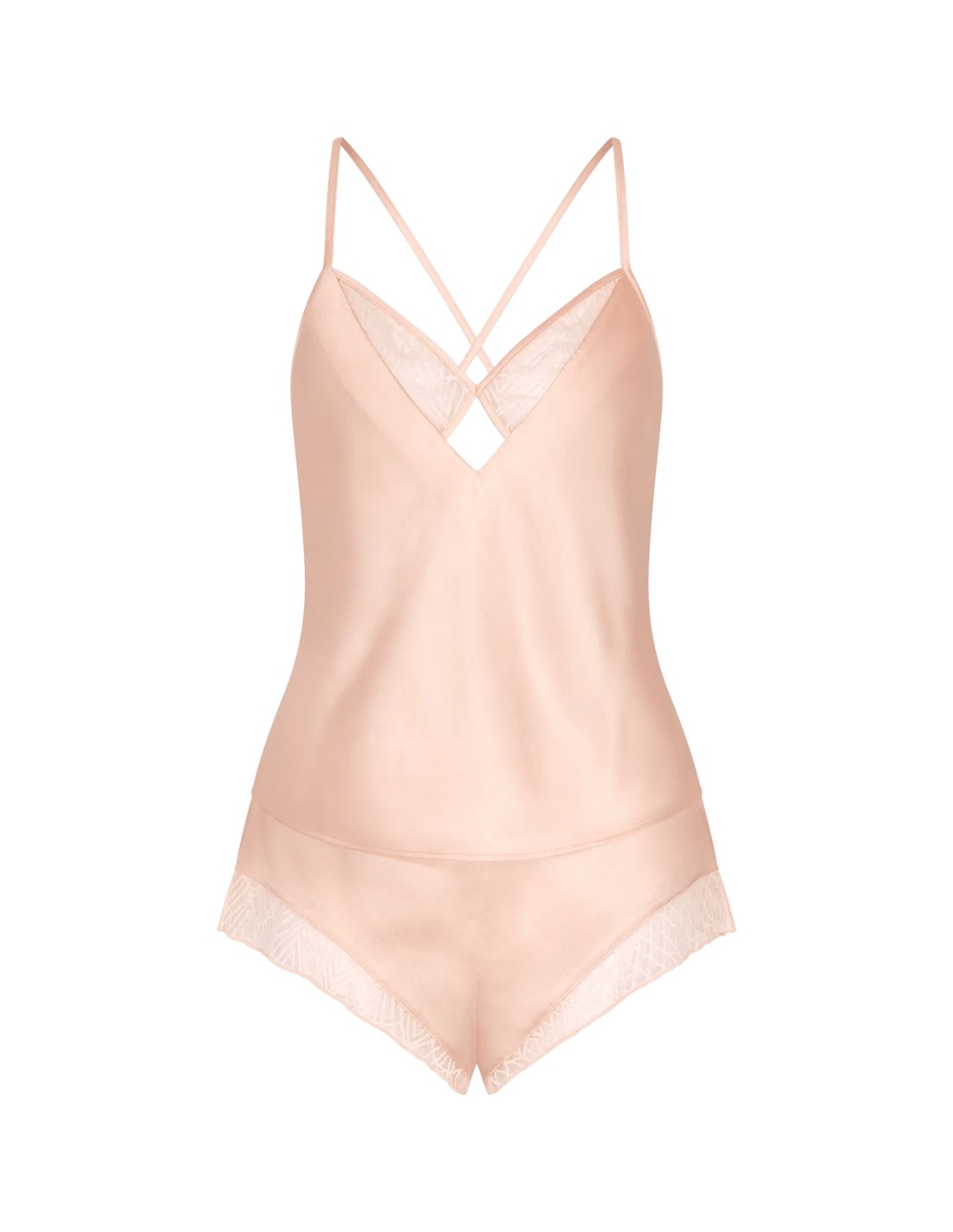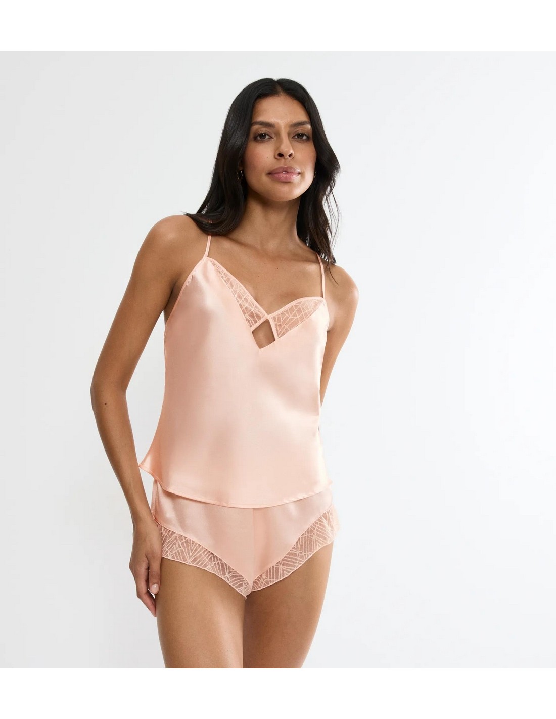 ? Sensual, low-covering shorts and deep-back camisole with lace inserts
