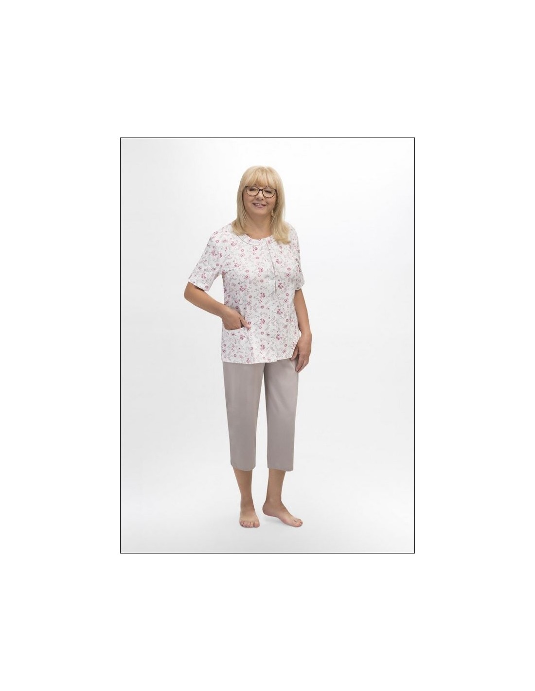 Piżama bawełniana z kieszeniami, zapinana na guziki, spodnie gładkie, w pasie komfortowa gumka, długość 3/4