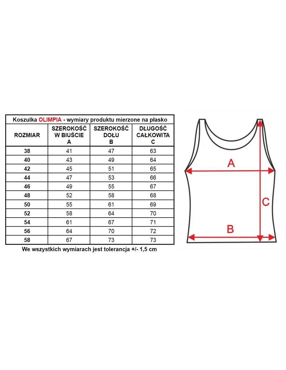 Olimpia to koszulka dla każdej kobiety, bez względu na rozmiar. Dostępna jest od rozmiaru 38 do rozmiaru 58; w czterech podstawowych kolorach: białym, ecru, beżowym i czarnym.