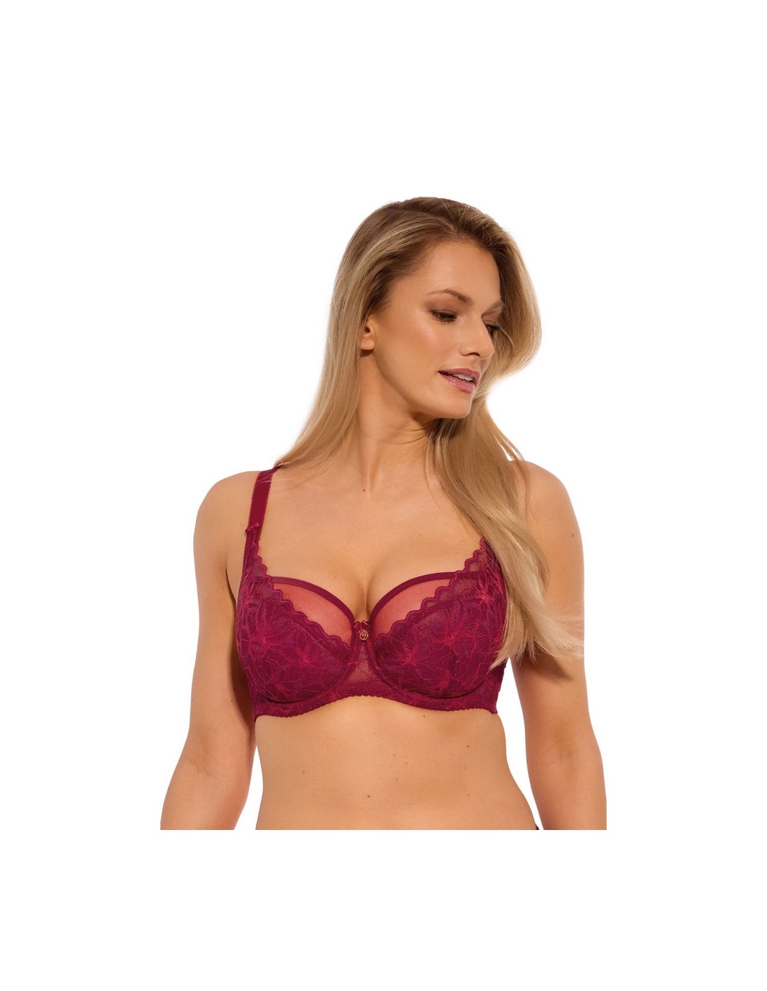 Biustonosz półusztywniany Gaia 1275 Evy w malinowym kolorze zapewnia doskonałe podtrzymanie biustu dzięki fiszbinom i pogłębionym miseczkom. Koronkowe detale dodają mu uroku.