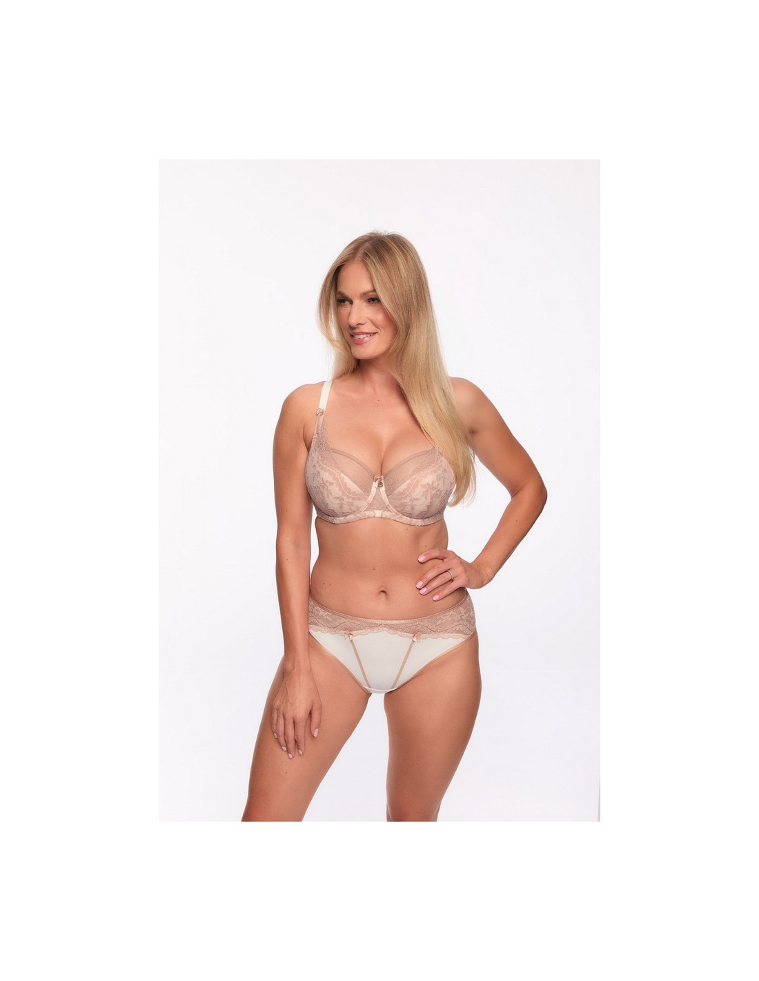 Stanik półusztywniany 1285 Gaia Simone z lekkim modelowaniem łączy w sobie elegancję i funkcjonalność. Miseczki w dolnej części są usztywnione cienką pianką, co podnosi biust i nadaje mu ładny kształt. Górna część miseczek zakończona jest siateczką, co dodaje lekkości i subtelności. Ramiączka są regulowane, nieodpinane, co gwarantuje stabilność oraz wygodę noszenia. Obwód wykonany z gładkiej mikrofibry nie posiada bocznej fiszbiny, co sprawia, że biustonosz jest komfortowy. Zapinany na dwie lub trzy haftki z trzystopniową regulacją, jest idealny na co dzień.