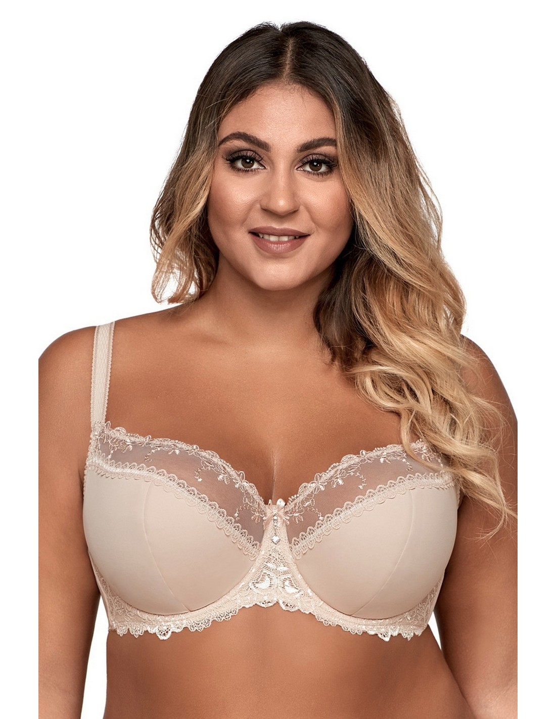 Biustonosz półusztywniony, konstrukcja znakomicie dopasowuje się do biustu, unosi i podtrzymuje piersi zapewniając maximum komfortu. Stanik wykonany jest z pianki i elastycznej tkaniny w dolnej części miski oraz pięknego haftu w górnej części.