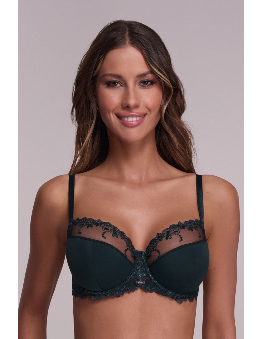 Biustonosz AV 1030 w nowej odsłonie kolorystycznej zachwyca elegancją i funkcjonalnością. Nietuzinkowy odcień benzynowej zieleni przyciąga wzrok, a sprawdzona konstrukcja K-1030 semi soft gwarantuje perfekcyjne dopasowanie do każdego typu biustu. Dolna część miseczek wykonana z miękkiej pianki pokrytej elastyczną dzianiną zapewnia stabilność i komfort użytkowania, natomiast górna - zdobiona subtelnym haftem na tiulu - dodaje lekkości i kobiecego wdzięku.