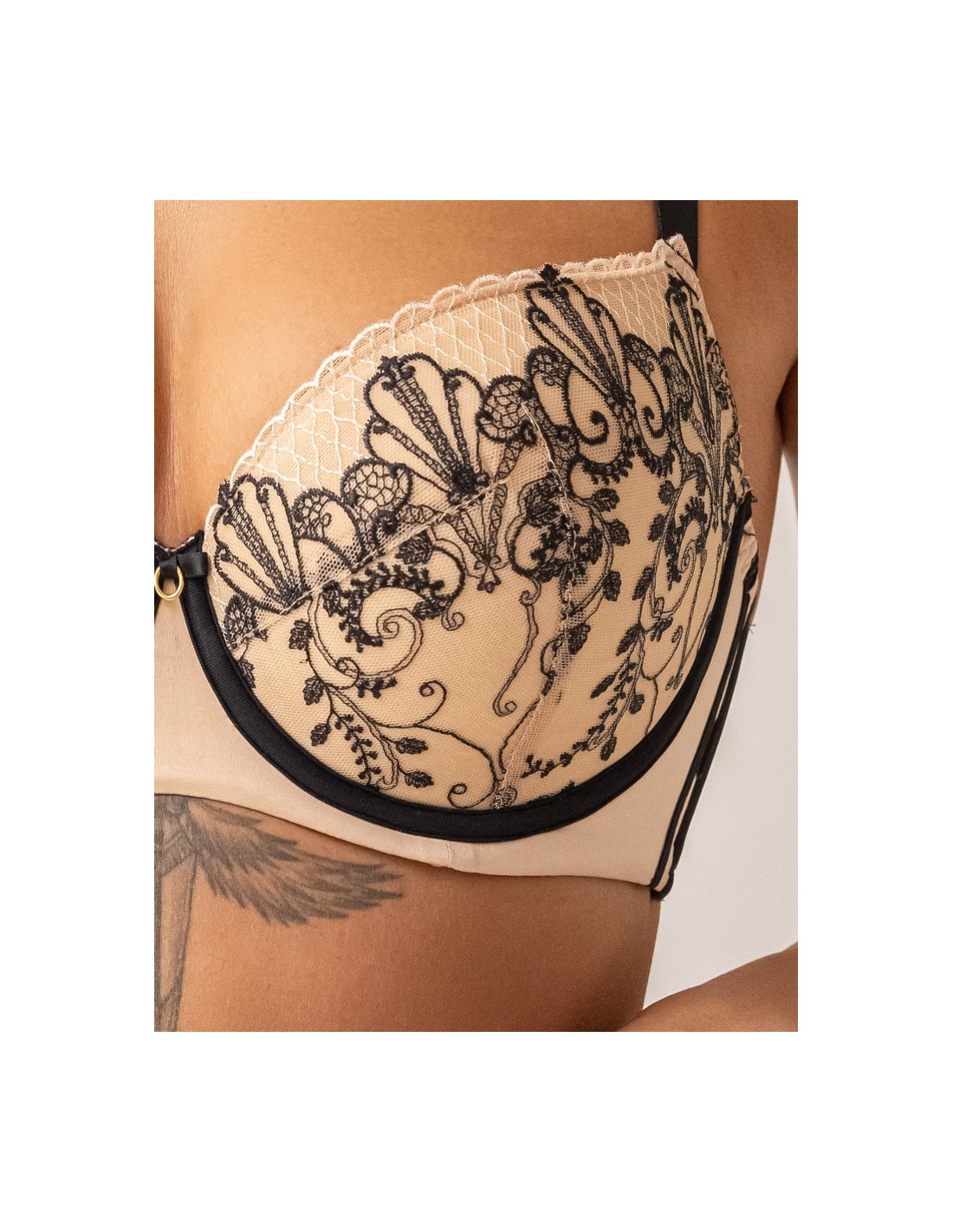 Biustonosz push up Krisline Oriental w beżowym kolorze z czarnym wykończeniem to elegancka bielizna damska. Doskonale podkreśla kształty, unosi biust i zapewnia wygodę. Idealny na wyjątkowe okazje oraz na co dzień.