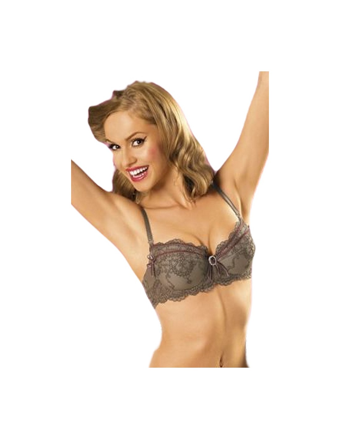 Ekskluzywny stanik w kolorze słodkiej czekolady sprawi, że poczujesz się rewelacyjnie wyjątkowa! Miseczki oraz boczki zdobi gustowna koronka. W środku dekoltu widnieje niewielka ozdoba dodająca dziewczęcej słodyczy... Ramiączka tego fasonu są odpinane, a wkładki wyjmowane, co pozwala na lepsze dopasowanie stanika do kształtu piersi.