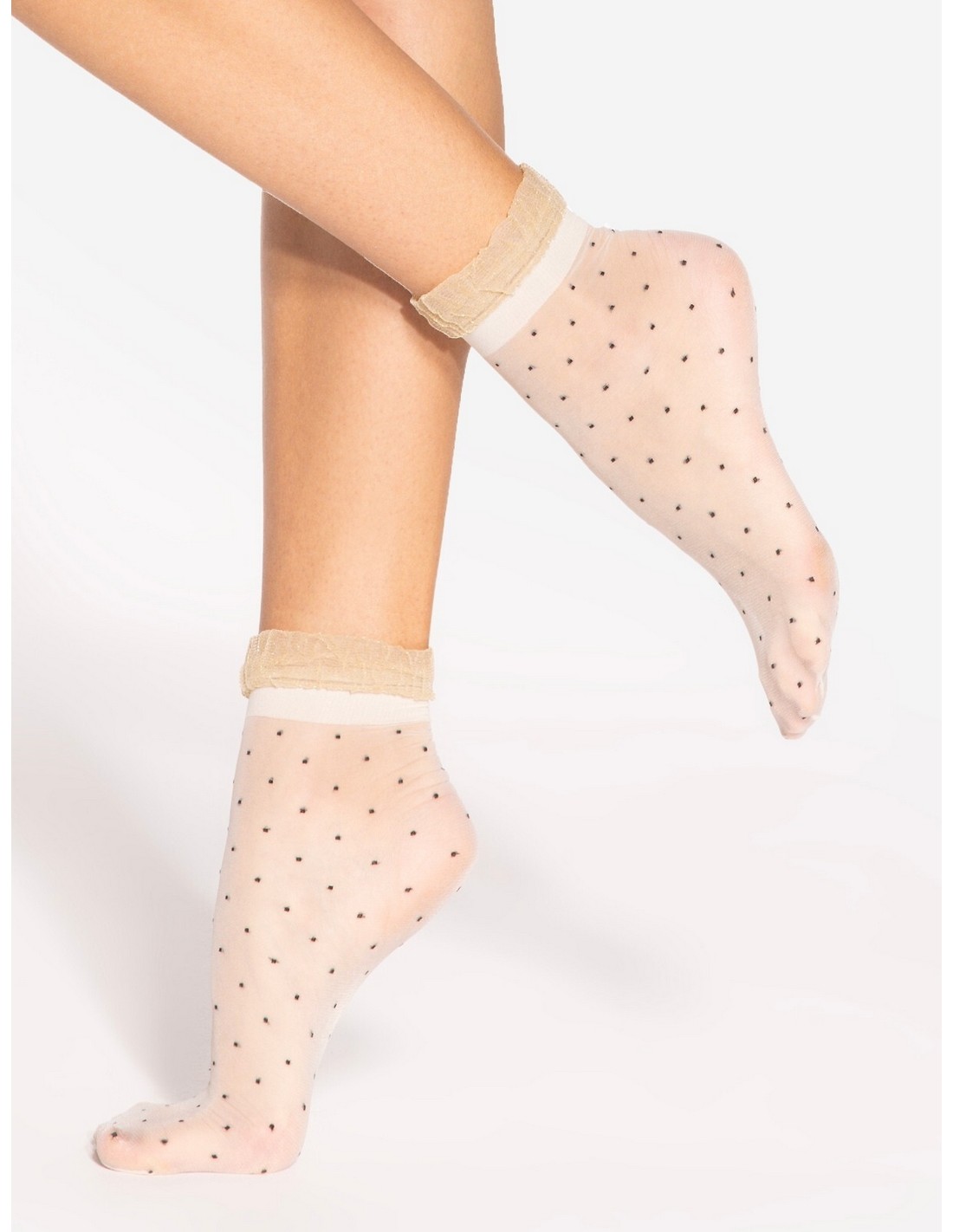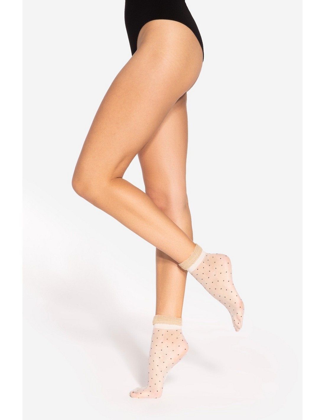 Gatta Spring Vibes wz. 06 to niezwykłe skarpetki 15 den, które łączą klasyczną subtelność z delikatnym błyskiem. Transparentna dzianina udekorowana drobnymi, regularnymi kropeczkami i eleganckim, metalizowanym ściągaczem sprawia, że ten model jest doskonałym dodatkiem zarówno do codziennych, jak i bardziej wyszukanych stylizacji. Wysoka zawartość elastanu gwarantuje sprężystość i komfort użytkowania, a metalizowane włókno dodaje całości wyjątkowego wdzięku. To doskonały wybór dla kobiet, które cenią detale i modową świeżość.