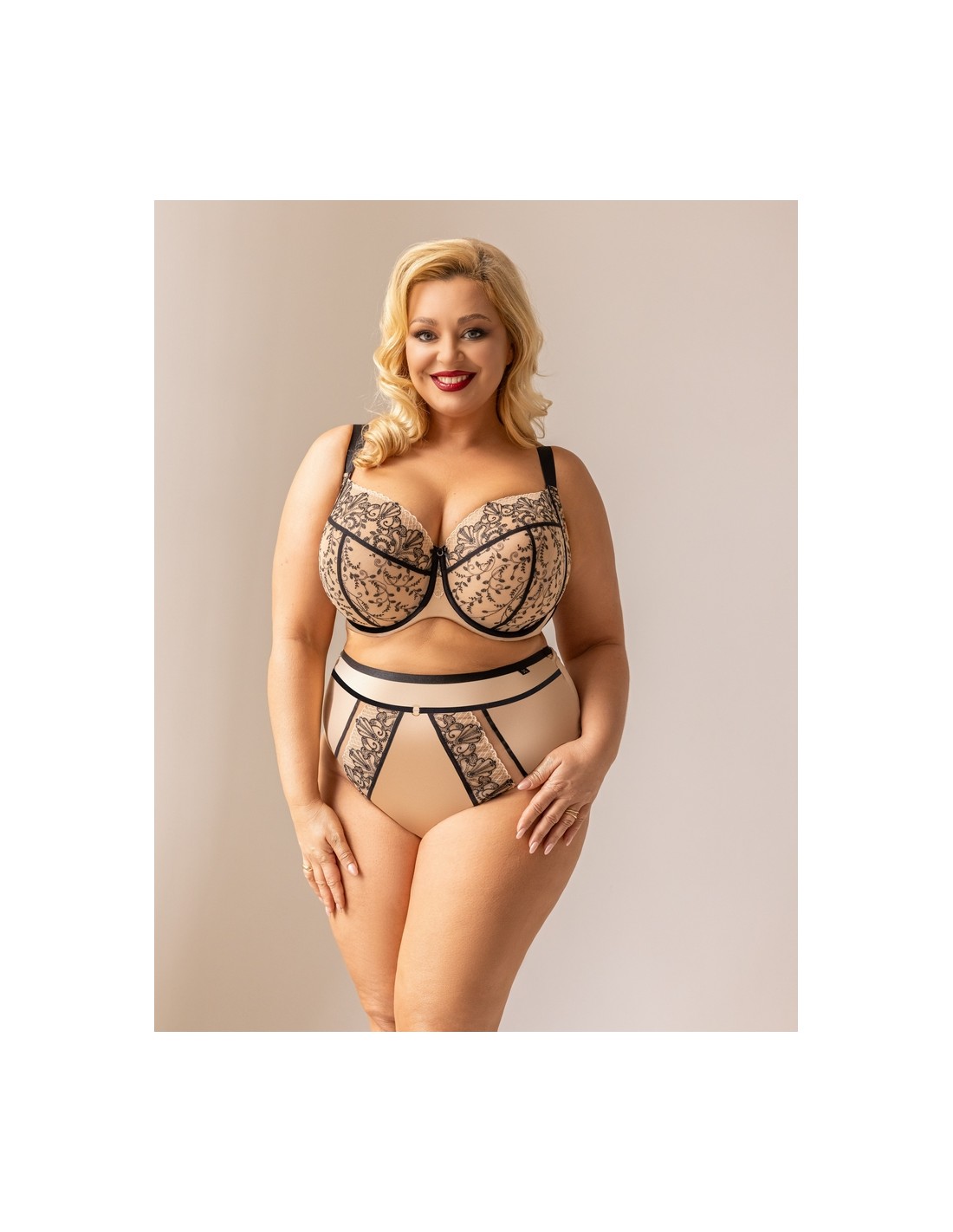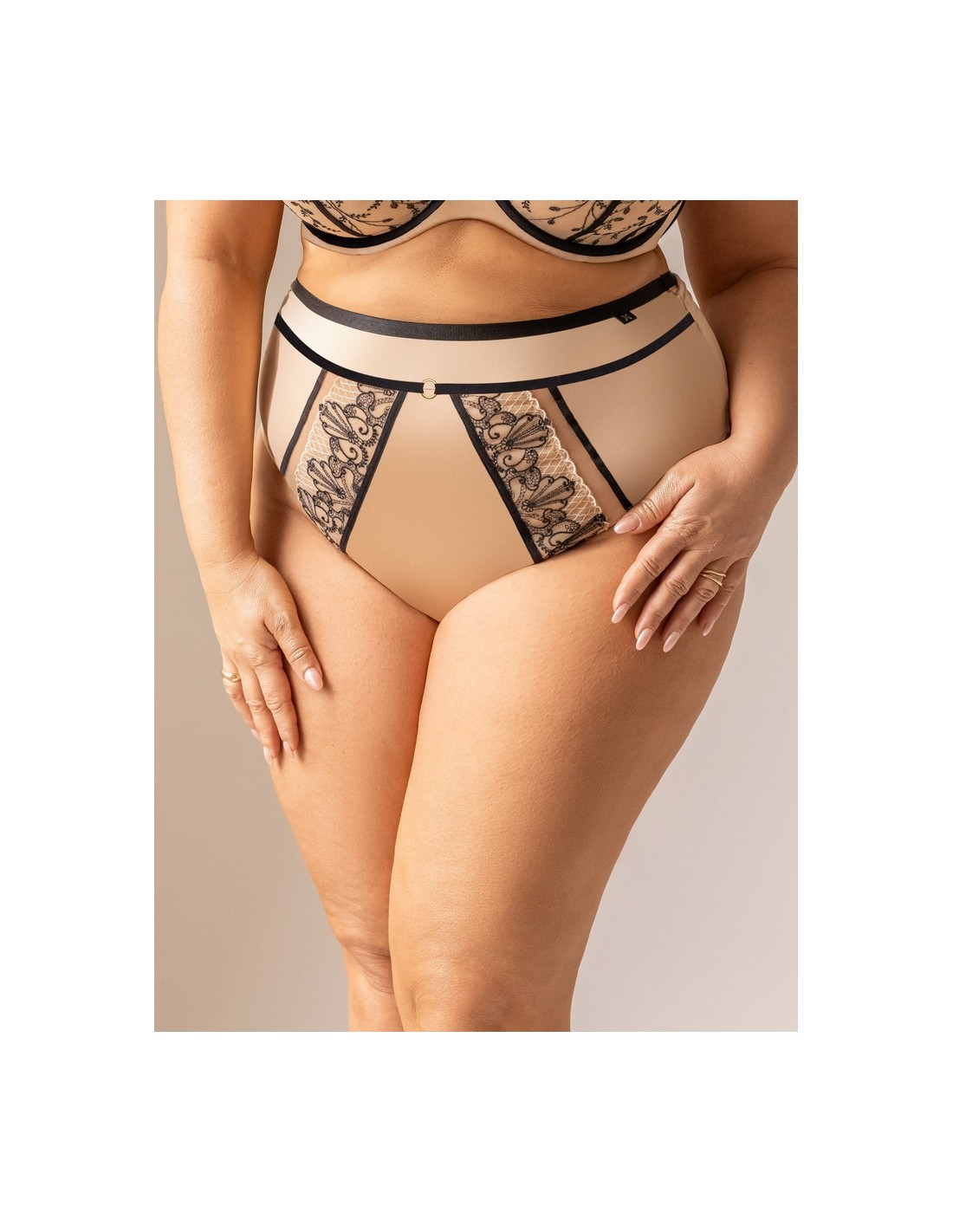 Beżowe stringi damskie z wysokim stanem Krisline Oriental z czarnym wykończeniem