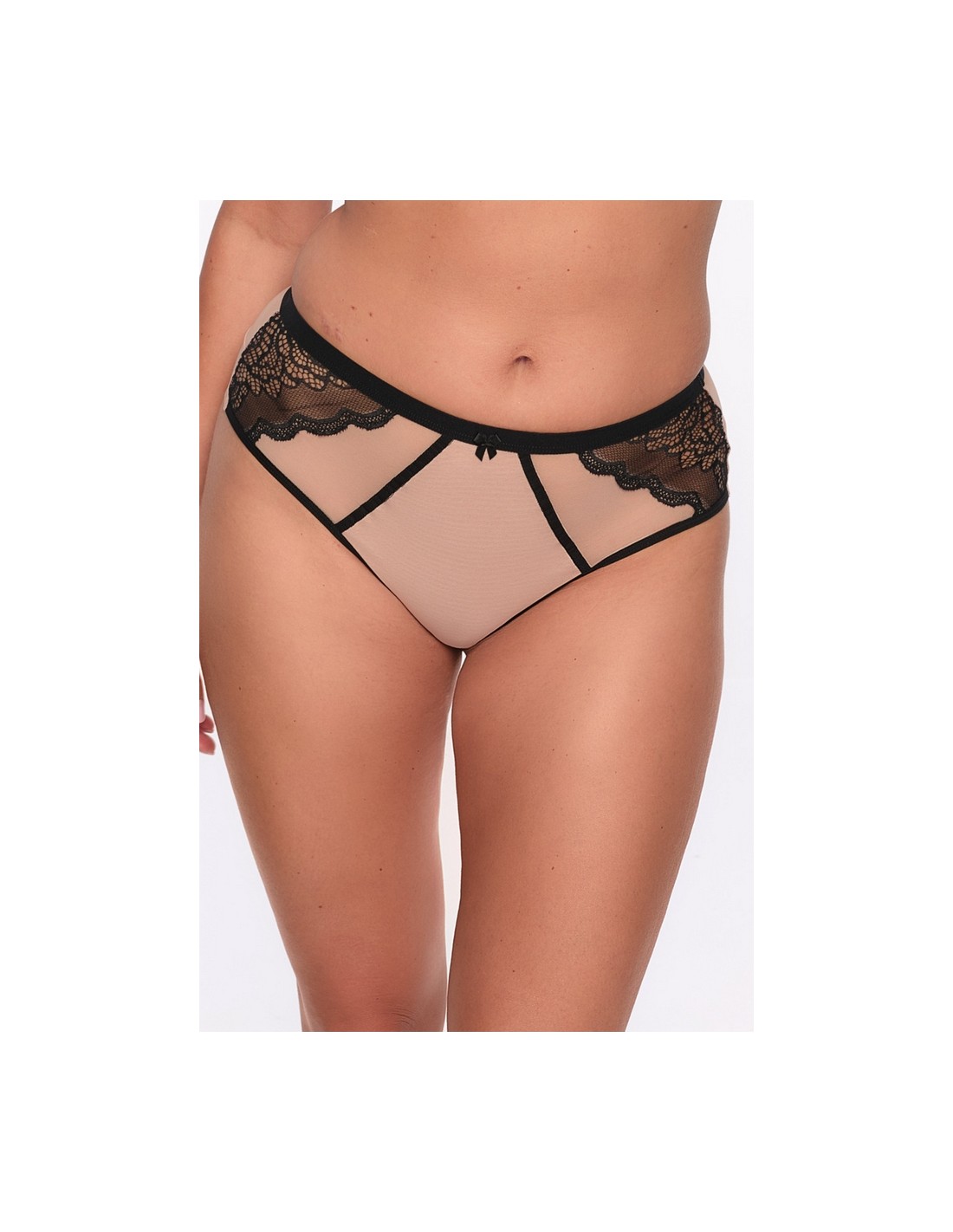 Figi damskie Gaia Carina 1287 wyróżniają się zmysłowym fasonem brazylian, który pięknie modeluje sylwetkę. Wykonane są z beżowej, delikatnej siateczki, a ich przód podszyty jest bawełną dla zapewnienia komfortu noszenia. Po bokach znajdują się ażurowe koronkowe detale, które dodają im elegancji. W talii zastosowano płaską czarną gumkę, co sprawia, że majtki dobrze trzymają się na ciele. Tył z podwójnej siateczki odsłania pośladki, nadając całości zmysłowego charakteru. Idealne na co dzień oraz na specjalne okazje.