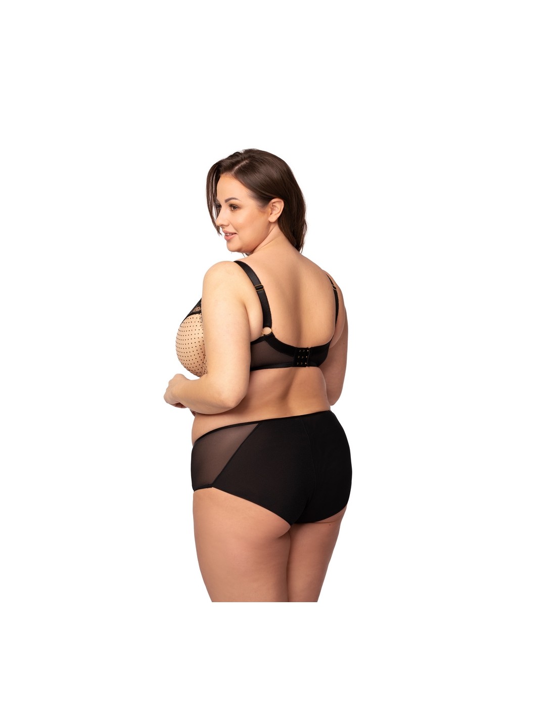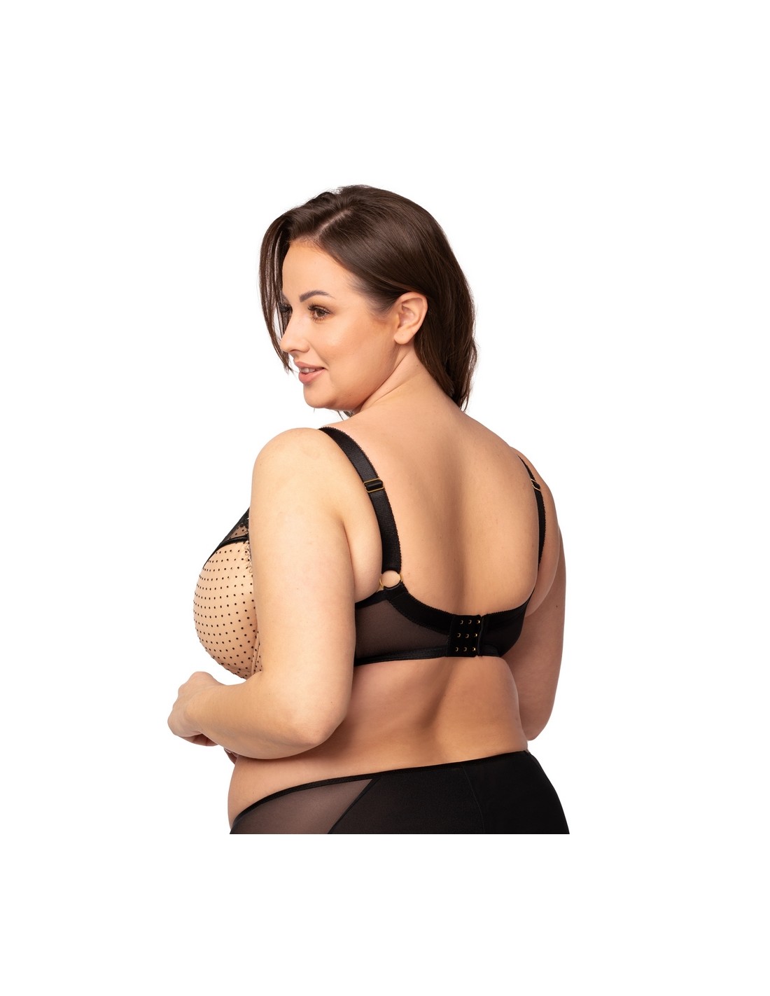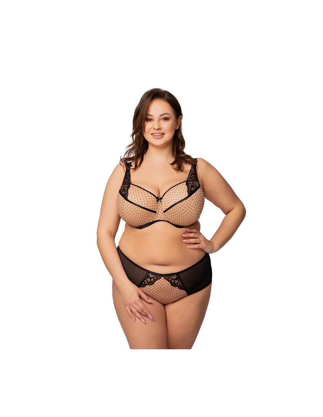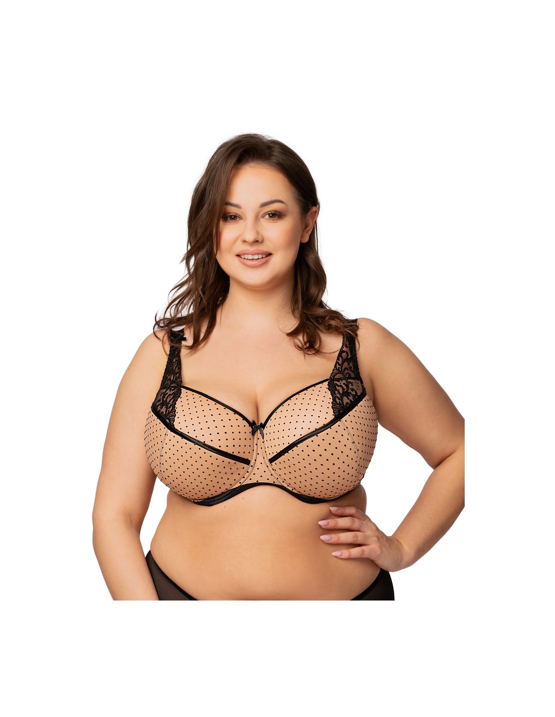 Stanik Jowita Nessa z fiszbinami charakteryzuje doskonałym krojem, który zapewnia optymalne podtrzymanie biustu. Regulowane, nieodpinane ramiączka w dwóch szerokościach gwarantują idealne dopasowanie do sylwetki. Miska biustonosza wykonana jest z delikatnej pianki i posiada jedno poziome oraz jedno pionowe cięcie, co podkreśla kształt. Boczki z elastycznej siatki o wysokiej gramaturze zapewniają komfort noszenia przez cały dzień. Biustonosz świetnie sprawdzi się na co dzień a jego stylowy wzór w czarne groszki na beżowym tle dodaje mu uroku.